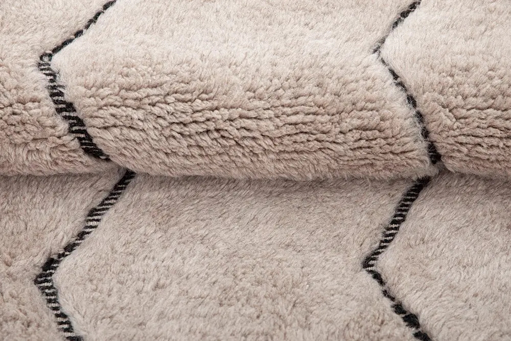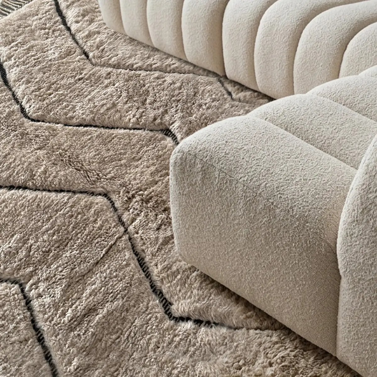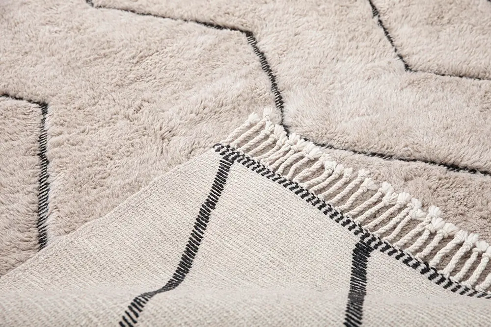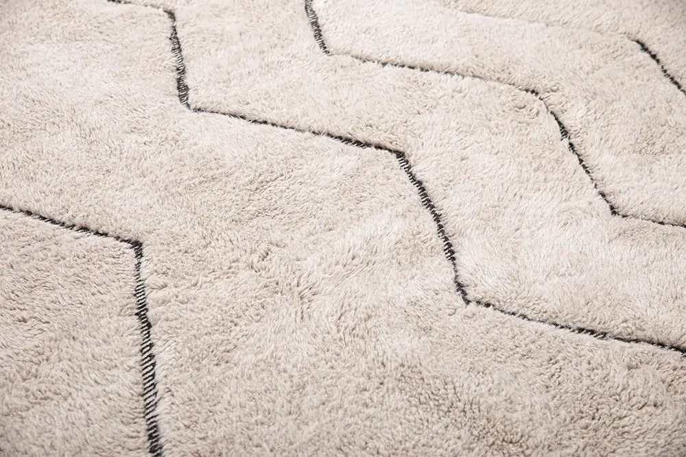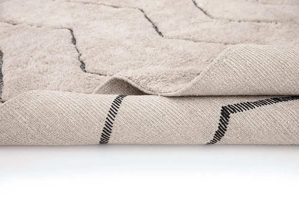 Elegant hand-knotted wool rug in Light Taupe, featuring zigzag patterns in Midnight Black. The bold yet minimalist design adds a dynamic focal point, elevating the ambiance of any space.