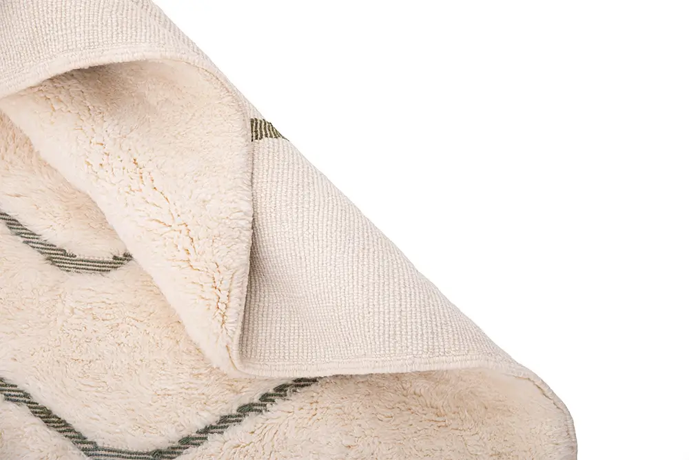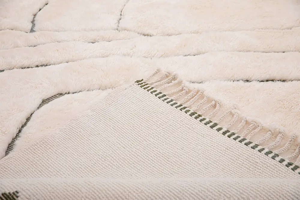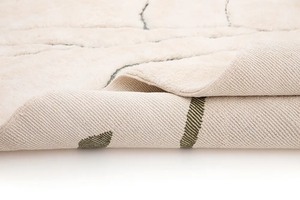 Elegant hand-knotted wool rug in soft Ivory accented with flowing lines in Chive Green and Flint Stone. The organic design evokes a sense of natural movement, while the subtle palette adds warmth and sophistication, making it a refined addition to any living or creative space.