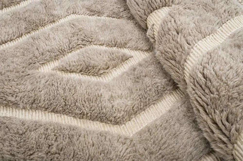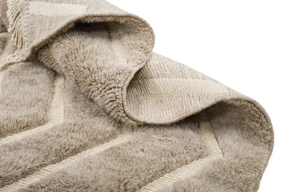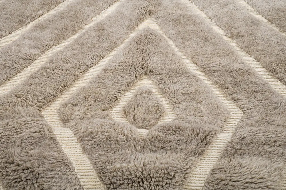 Timeless hand-knotted wool rug in Light Taupe with a bold diamond pattern in contrasting Ivory. The layered, textured design brings depth and elegance, making it a perfect centerpiece for adding warmth to any room.