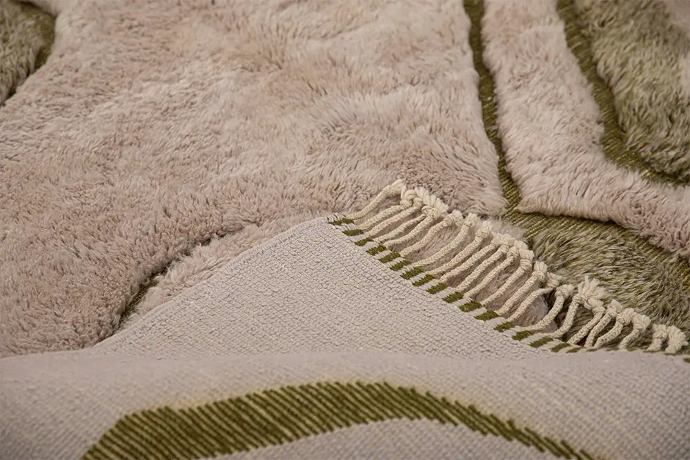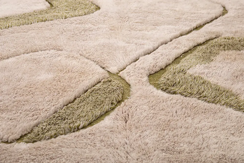 Distinctive hand-knotted wool rug in Light Taupe and Olive Green, showcasing bold, abstract shapes with organic curves. The textured design and earthy tones bring a sense of artistry and natural elegance, making it a striking centerpiece for living or creative spaces.