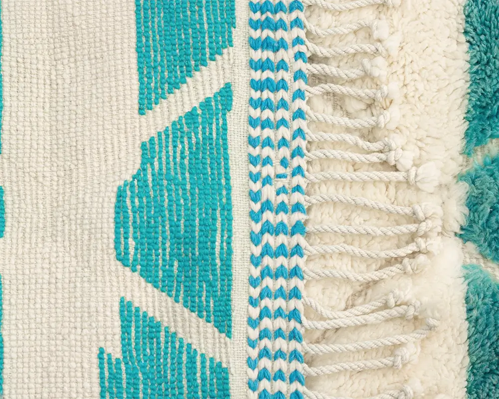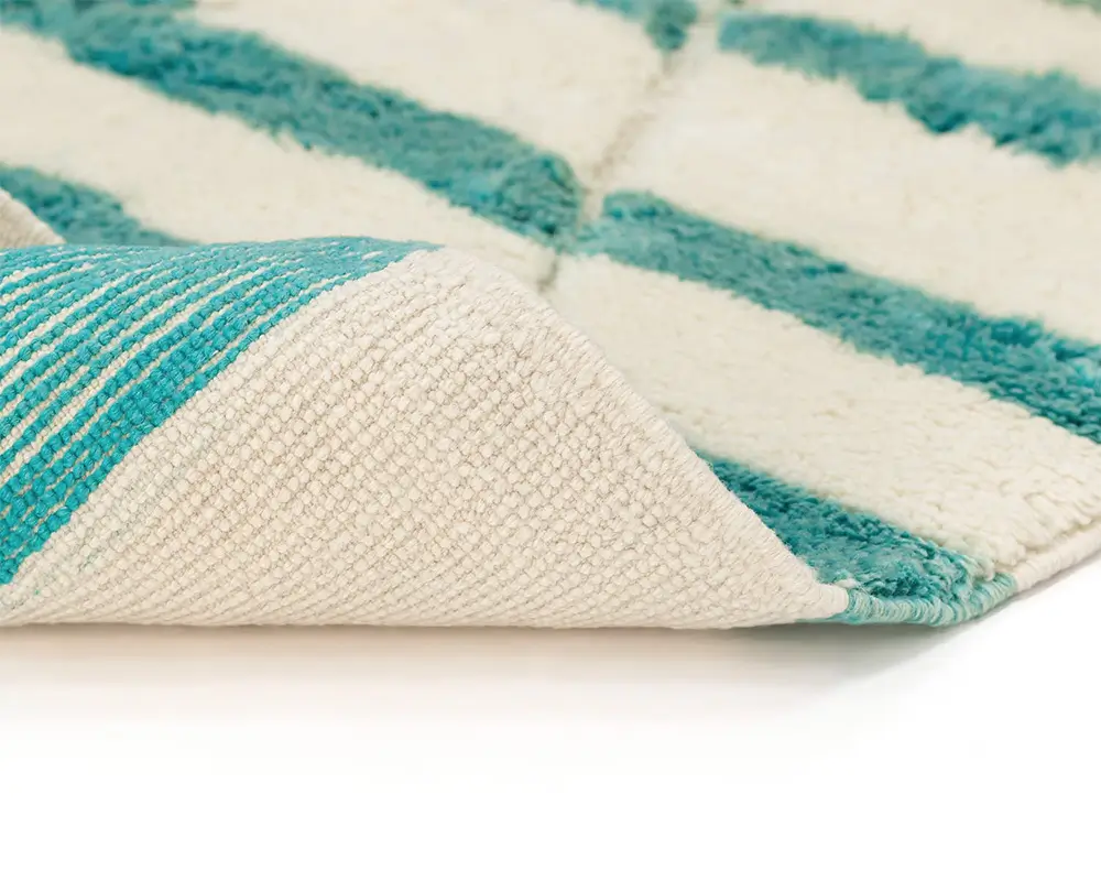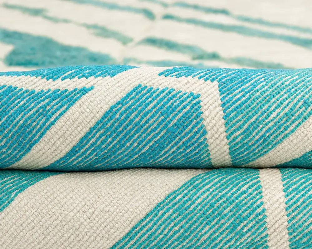 Vibrant hand-knotted wool rug with a dynamic Turquoise geometric pattern on an Ivory background, offering durability and timeless elegance for any setting. Ideal for enhancing diverse interiors.
