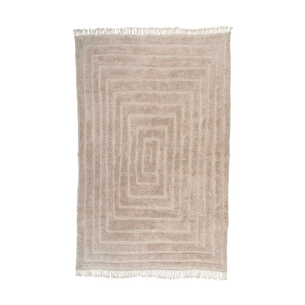 An authentic Moroccan artisanal rug in beige and cream features a checkered grid pattern with fringed edges.