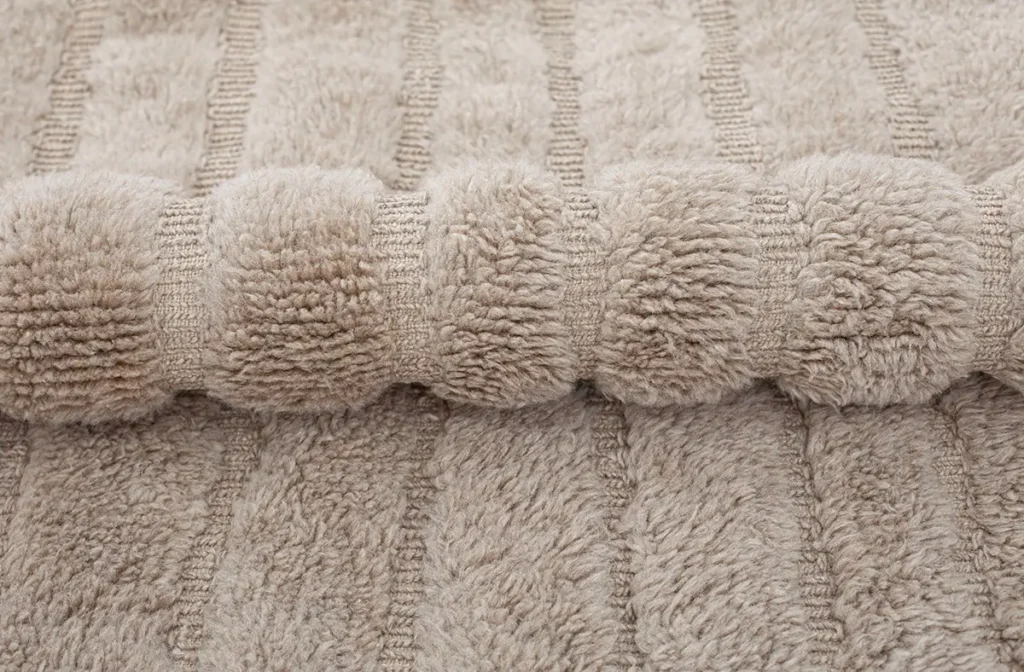 A close-up of a cream-colored textured rug with a corner folded over, showing its soft, plush surface and woven underside.