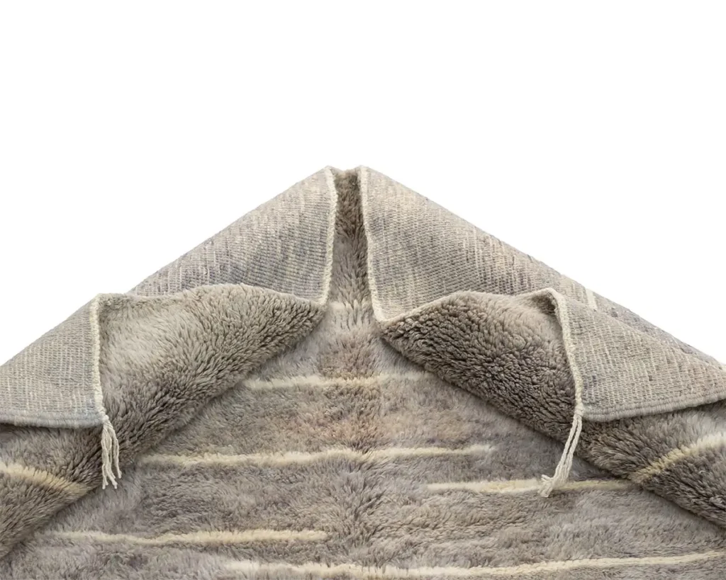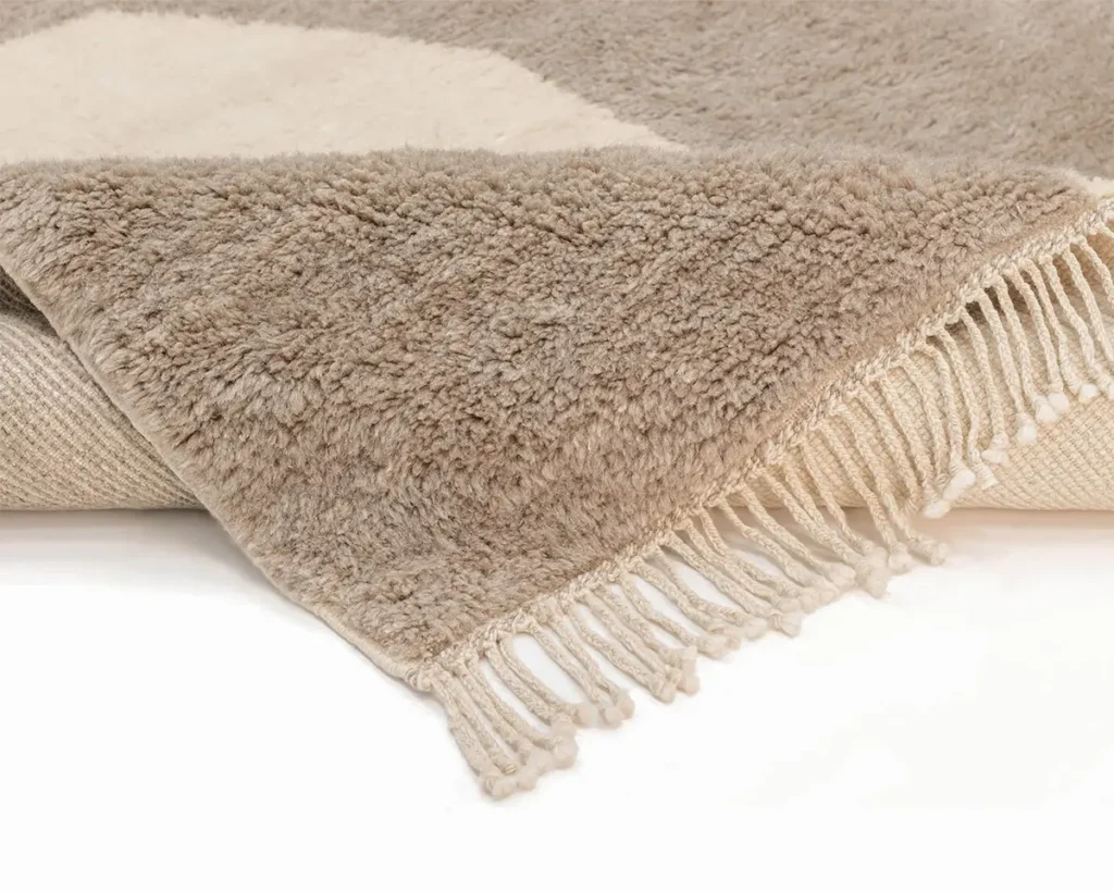 This close-up captures the intricate textures of a folded beige and gray rug, highlighting its lush pile and detailed woven backing.
