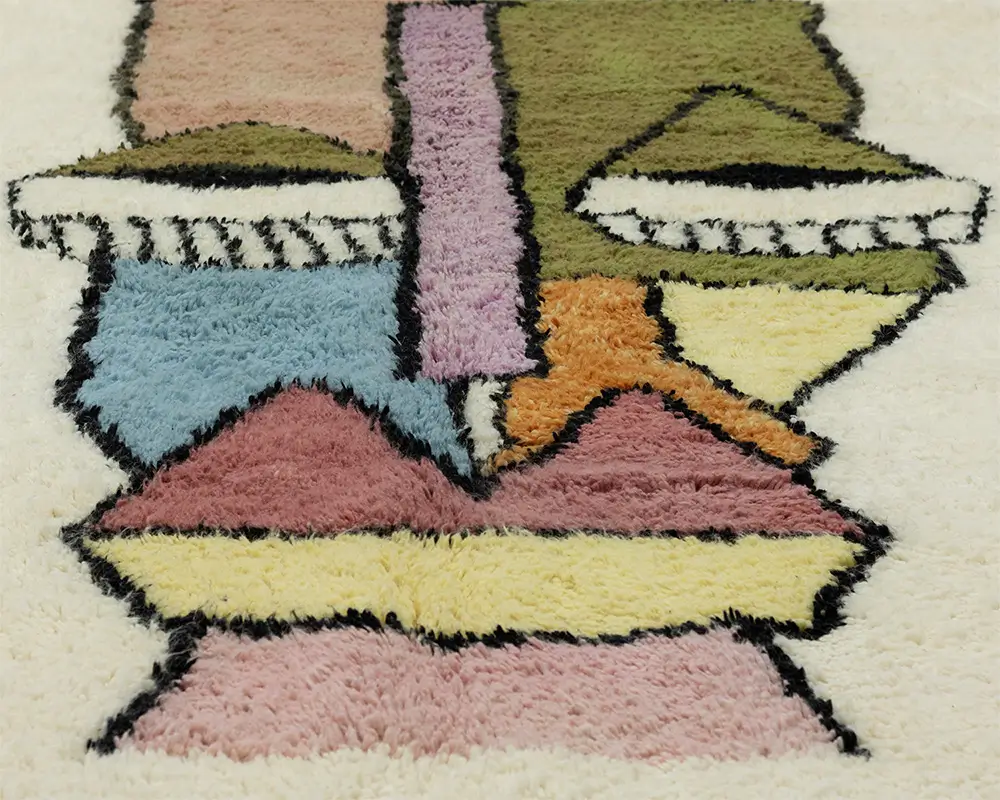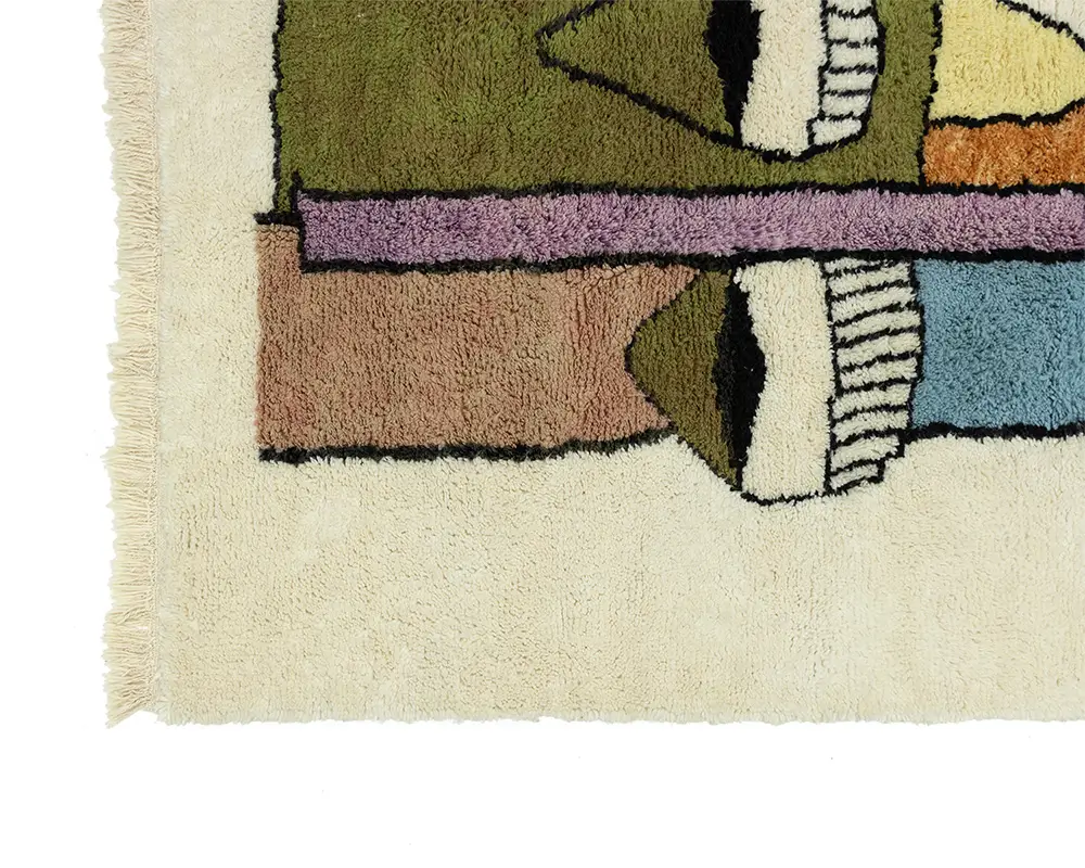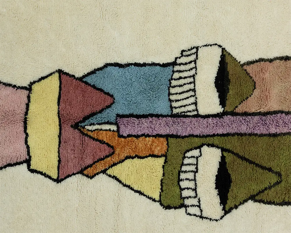 Striking hand-knotted wool rug featuring an abstract face design with accents in Olive Green, Dusty Pink, Burnt Orange, Yellow, Withered Rose, Midnight Black, Purple Rose, and Sky Blue on an Ivory background. This textured piece adds an artistic flair to any interior.