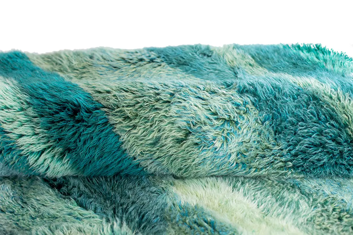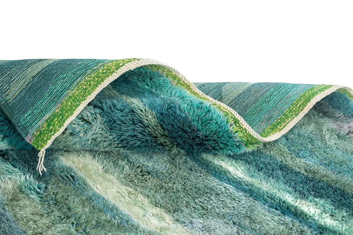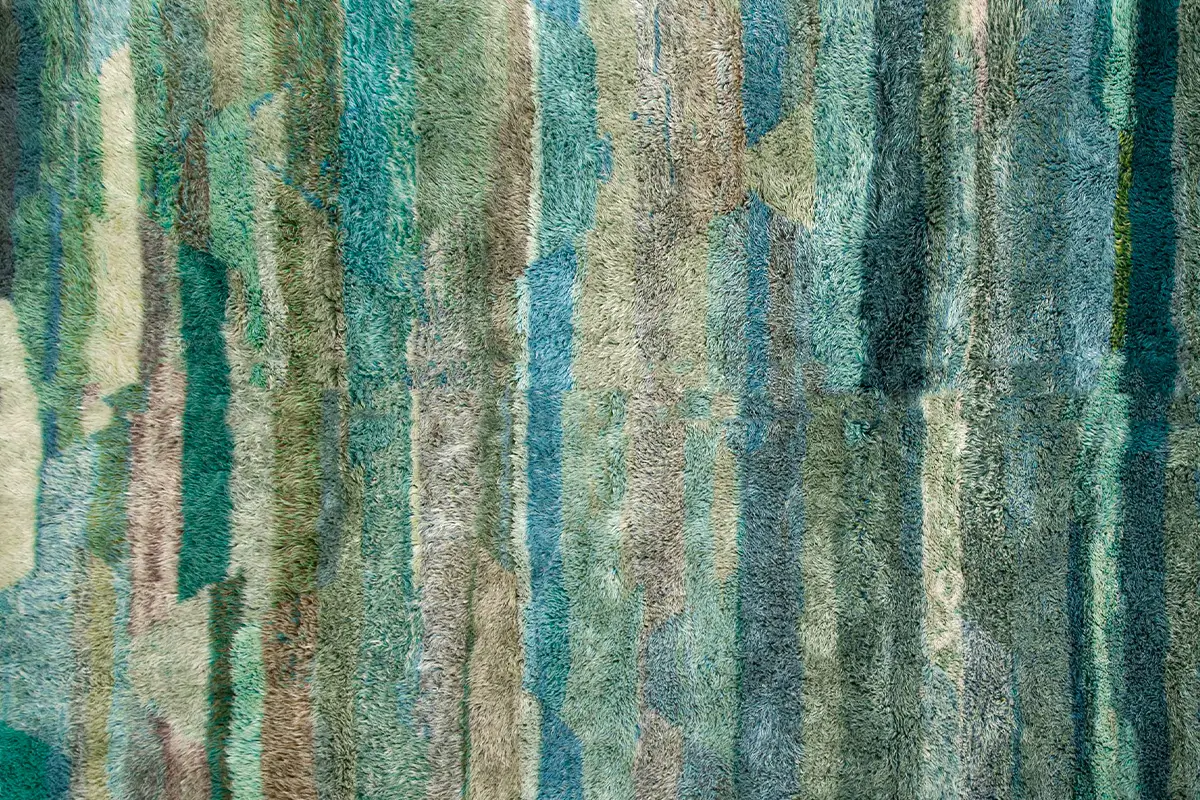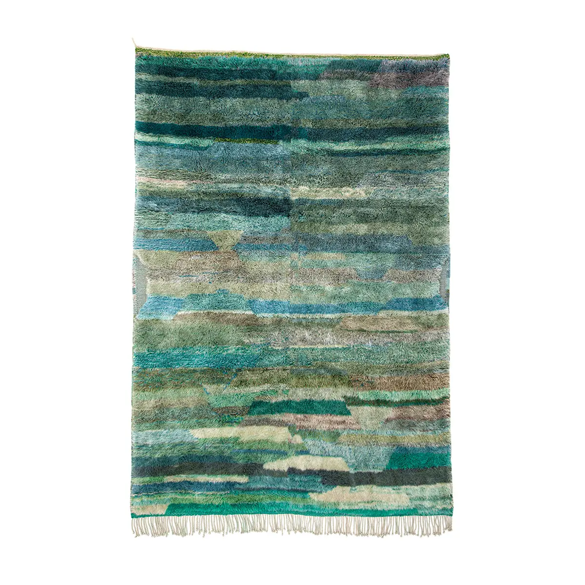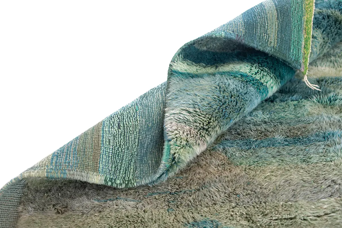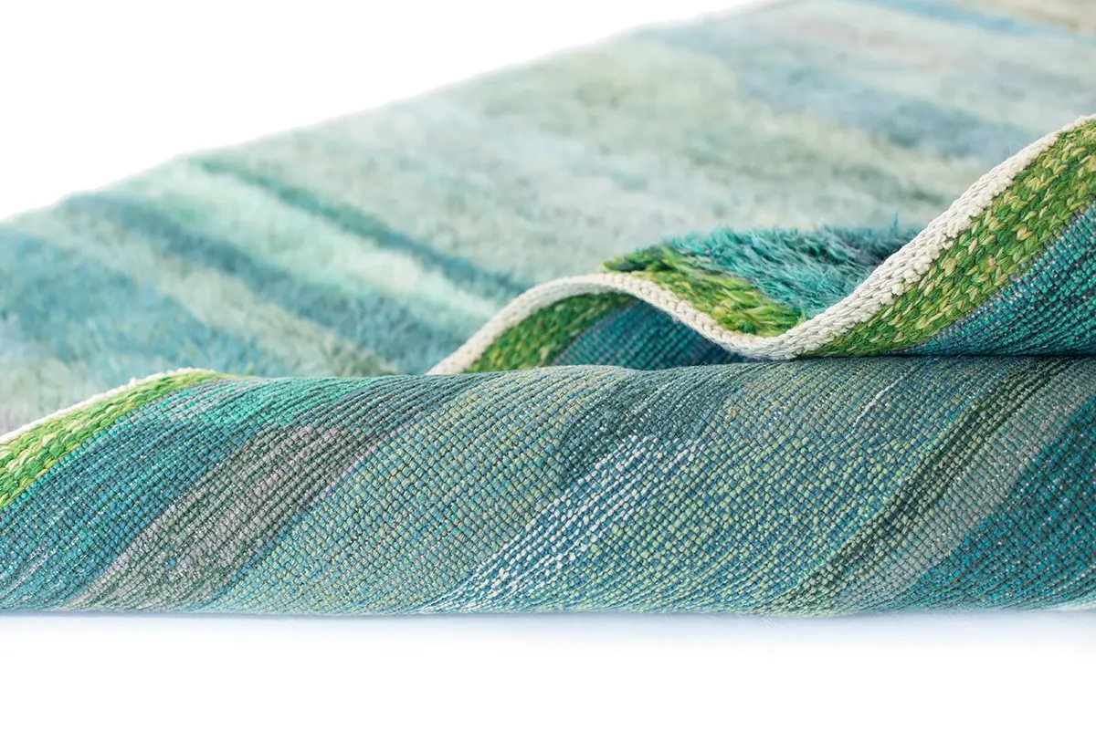 Stunning hand-knotted wool rug in calming shades of Turquoise, Aegean Blue, Taupe, Green Heron, Olivine, Storm Blue, and Sage. This abstract design adds a touch of elegance to any living space, perfect for enhancing your home’s decor.
