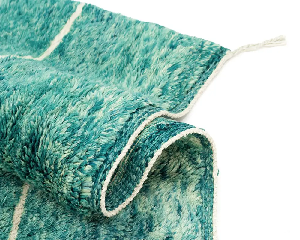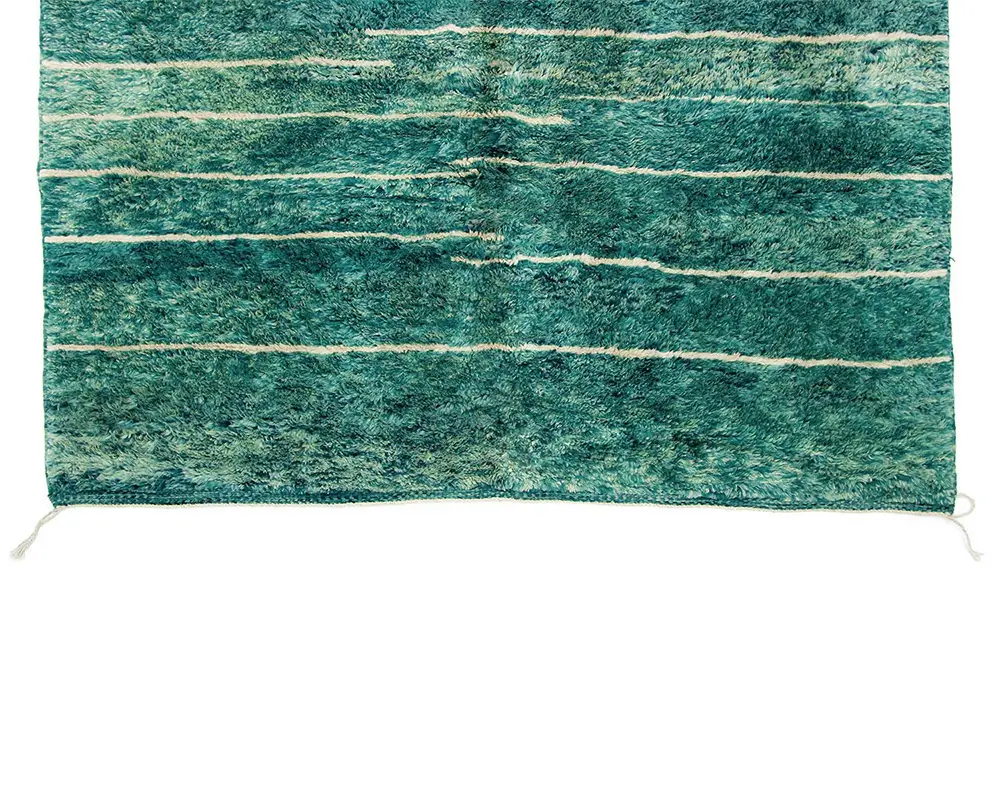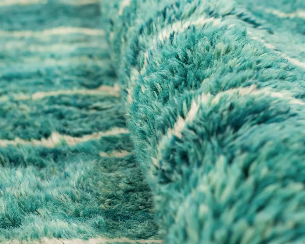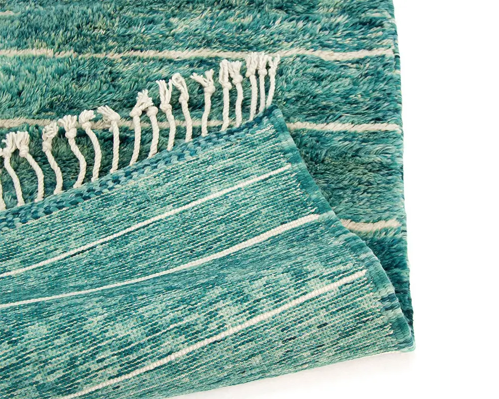 Exquisite hand-knotted wool rug with wool enchants, with a blend of Blue and Emerald Green accented by Cream lines. Ideal for adding depth and texture to any space.