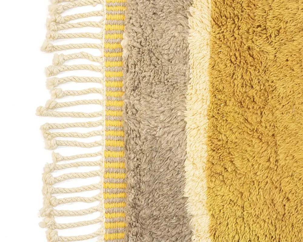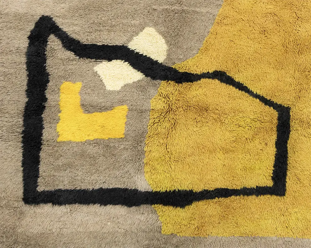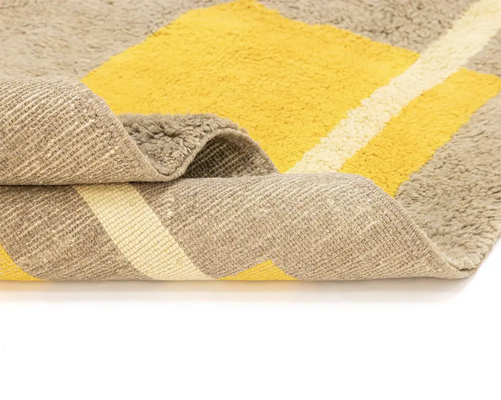 Abstract hand-knotted wool rug with bold blocks of Luminous Yellow, Goldenrod Yellow, Lime Green, and Taupe, framed by Ivory and Midnight Black lines. A modernist piece that adds a splash of color and a unique, artistic touch.