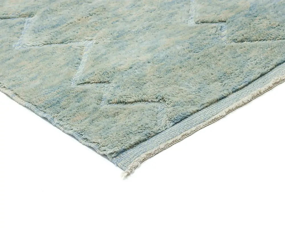 Elegant hand-knotted wool rug featuring a gentle Aqua Blue shade interlocking with Natural wool adorned with a delicate seamless zigzag pattern. Perfect choice for adding a serene and refined ambiance to any room.