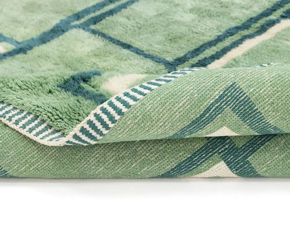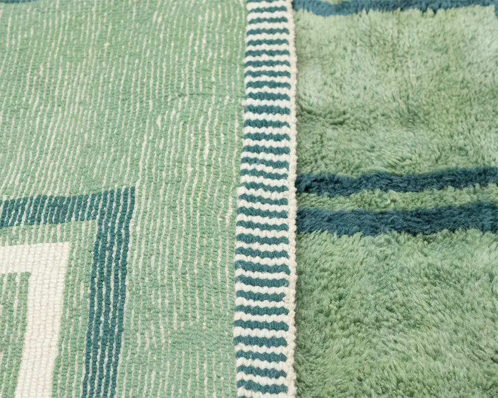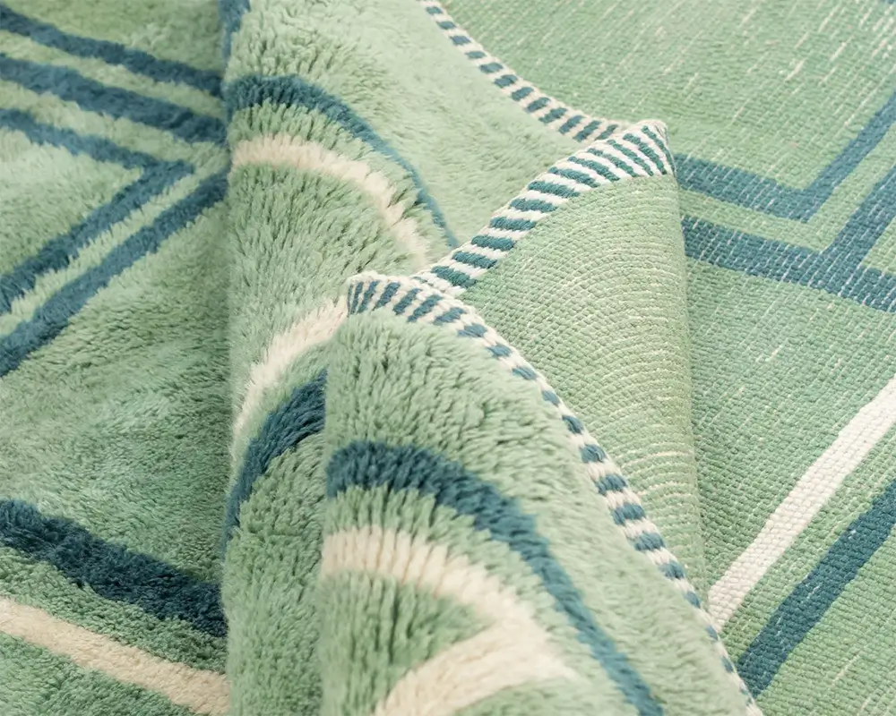 Exquisite hand-knotted wool rug in stunning Laurel green with geometric outlines in Ivory and Teal Green, adding a modern touch perfect for infusing color and contemporary style into any living area.