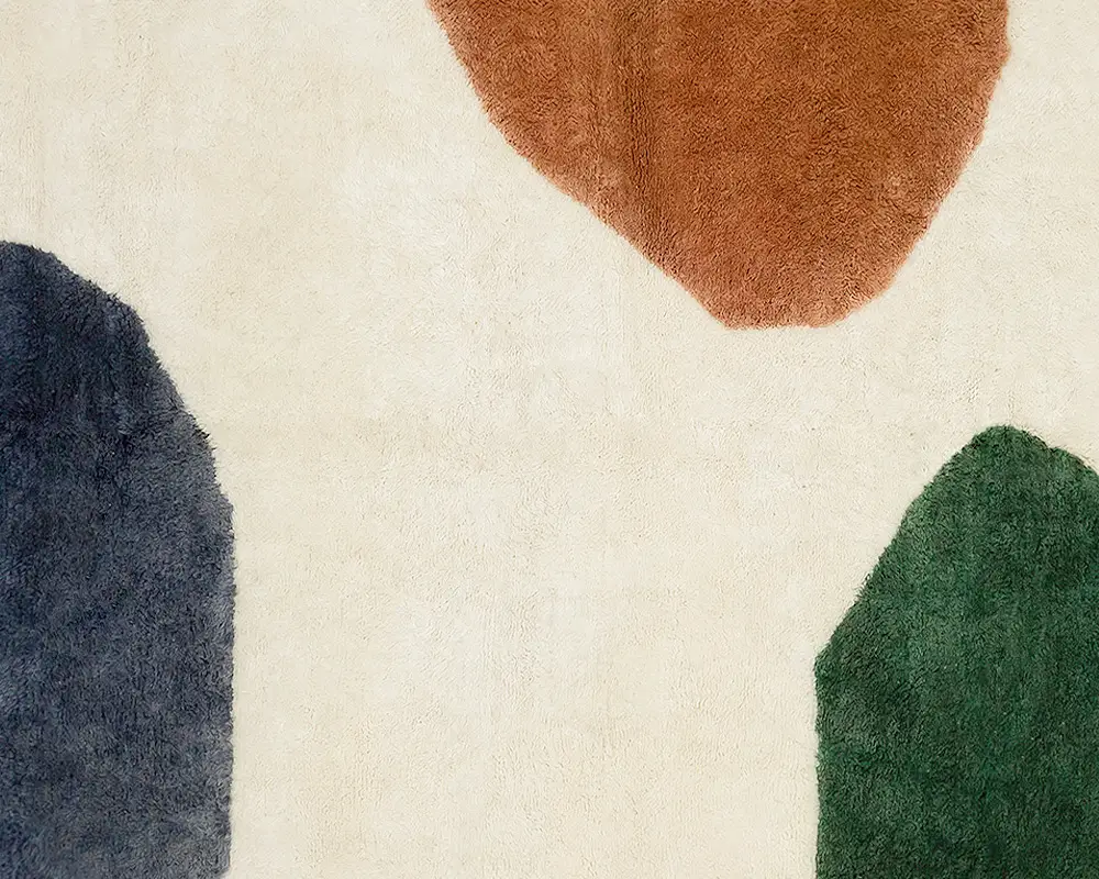 Modern hand-knotted wool rug featuring abstract shapes in Sunlit Sienna, Forest green, and Midnight Blue on an Ivory background, adding a bold and artistic touch to any space.