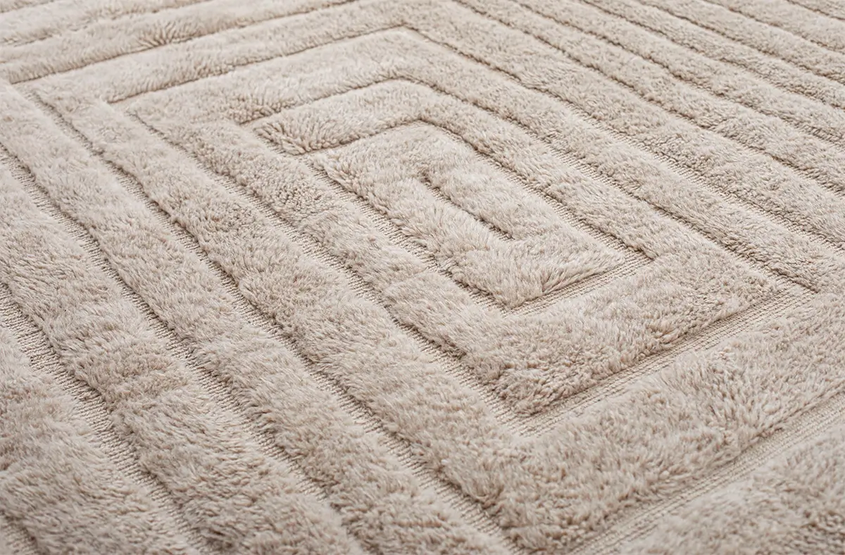 Elegant hand-knotted wool rug in Warm Sand, featuring a layered geometric pattern that exudes subtle depth and texture. Its versatile tone harmonizes effortlessly with various interior styles, offering a refined touch to your living space.