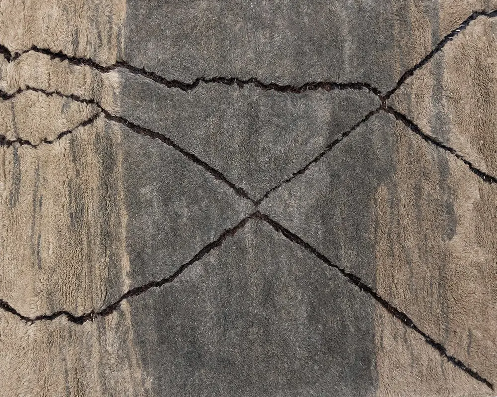 Luxurious hand-knotted wool rug, blending Light Taupe and Granite Gray tones with dynamic flat-woven abstract lines in Midnight Black, perfect for adding a modern yet warm element to interiors.