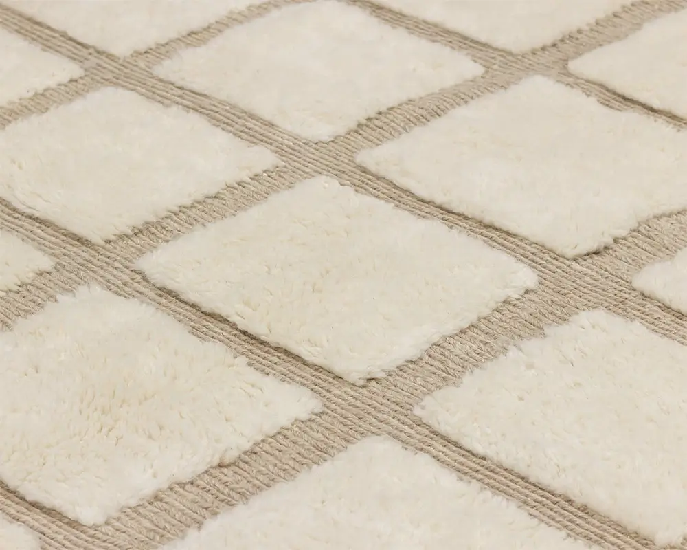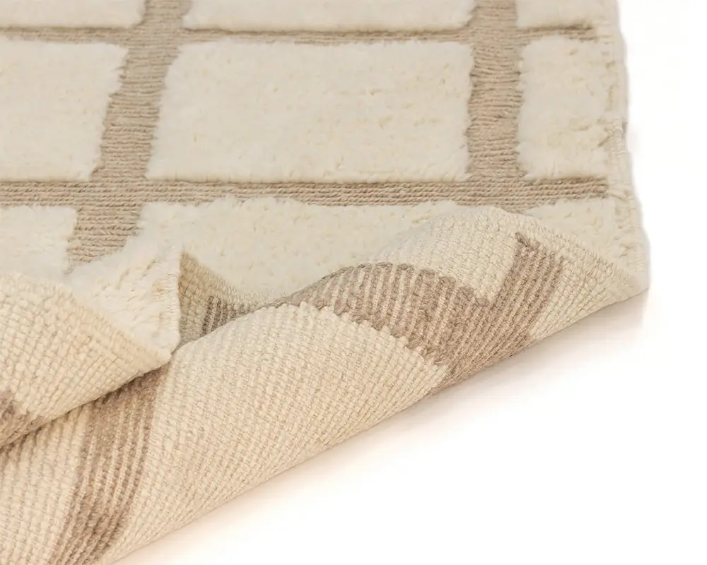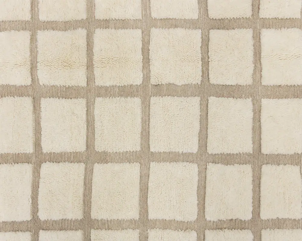 Sophisticated hand-knotted wool rug featuring a grid pattern in natural Ivory and Taupe, with handwoven detailing for a touch of artisanal elegance in any home setting.