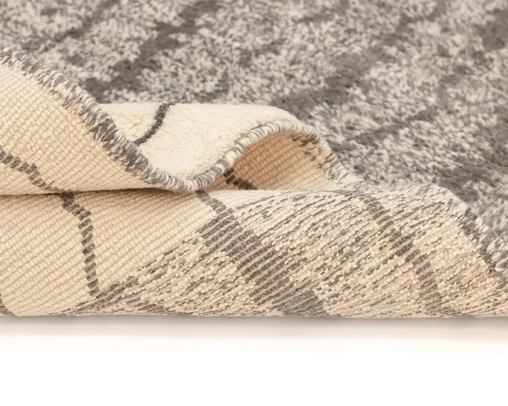 Close-up of a beige textured rug with a soft, fluffy surface showing both the woven underside and the plush upper side.