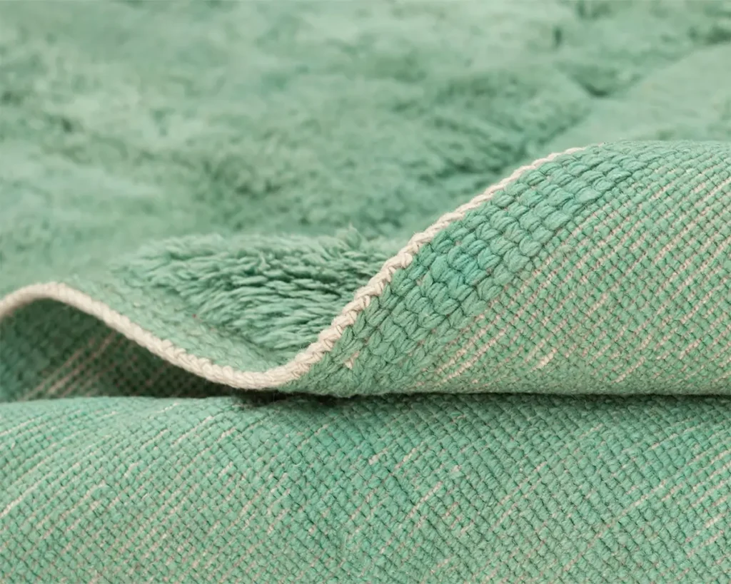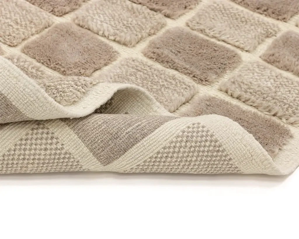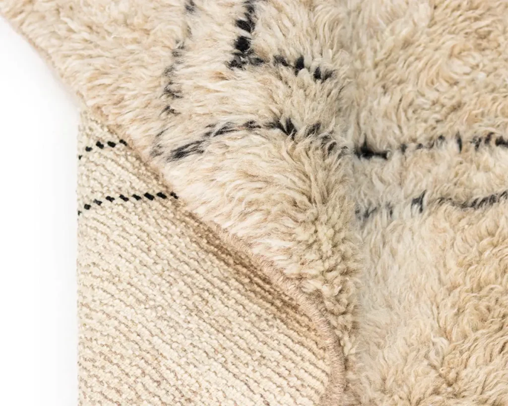 A close-up view of a beige textured rug with raised, soft, fuzzy stripes and a visible woven underside.