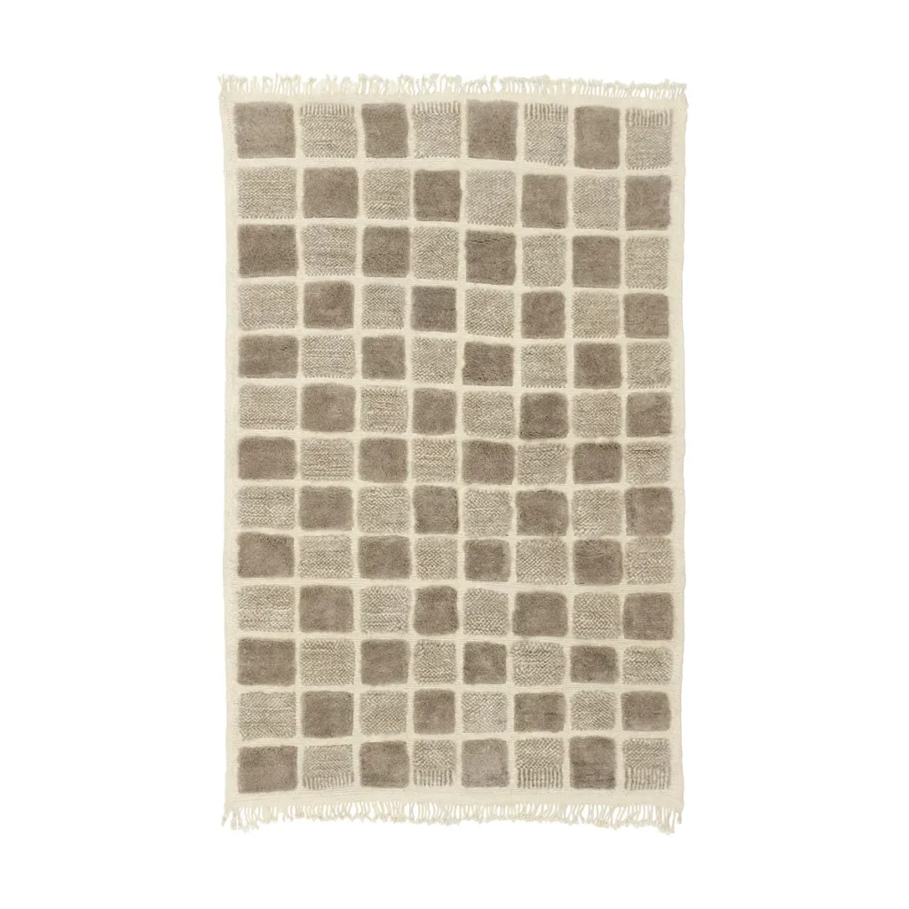 This hand-knotted beige square rug features a subtle grid pattern and fringed edges, adding a touch of luxury to any space.
