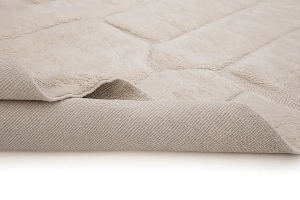 Close-up of a folded, beige textured luxury rug with a chevron pattern. It has a soft, plush surface and a woven underside, epitomizing elegance and comfort.