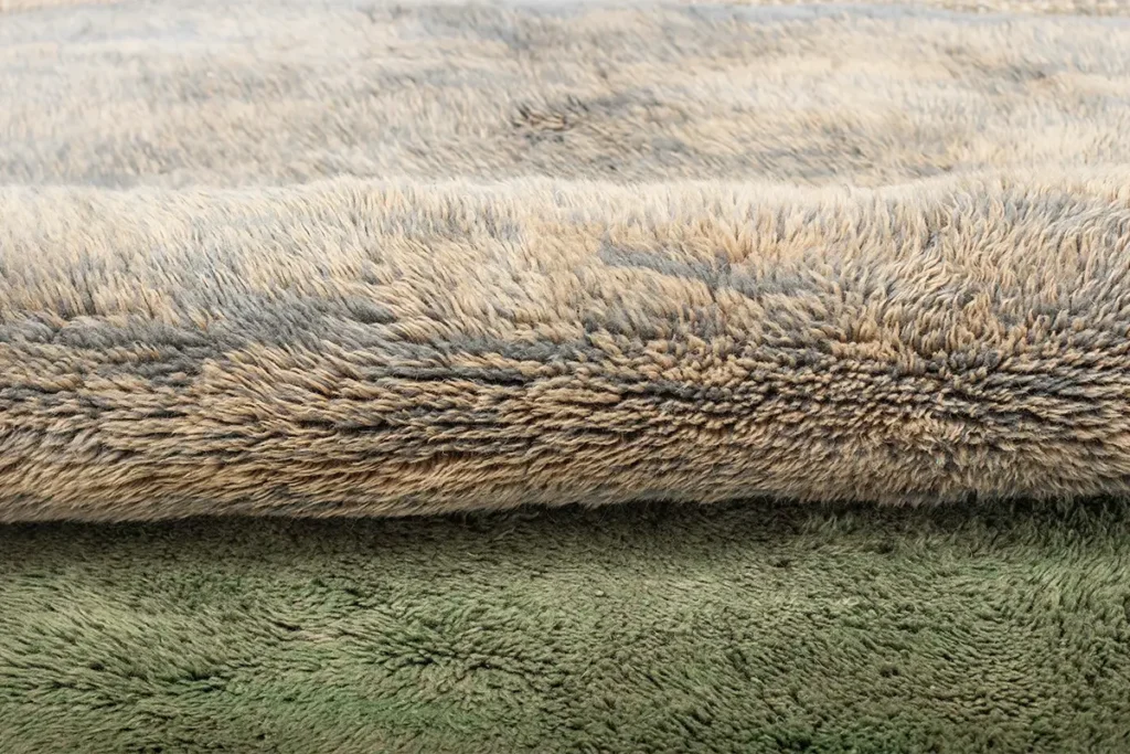 A close-up of a folded brown and beige wool creation with a geometric pattern, revealing its textured and plush surface. This hand-knotted piece exudes the quality and craftsmanship of authentic Moroccan rugs.