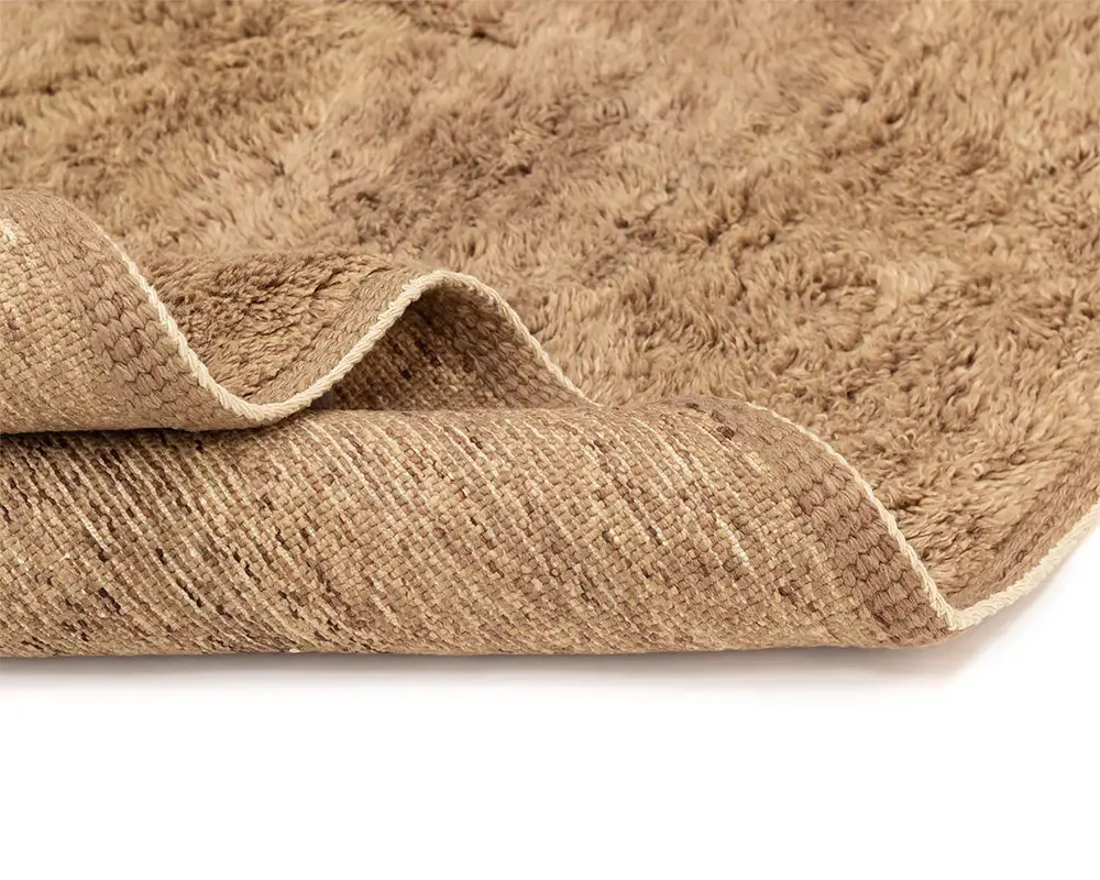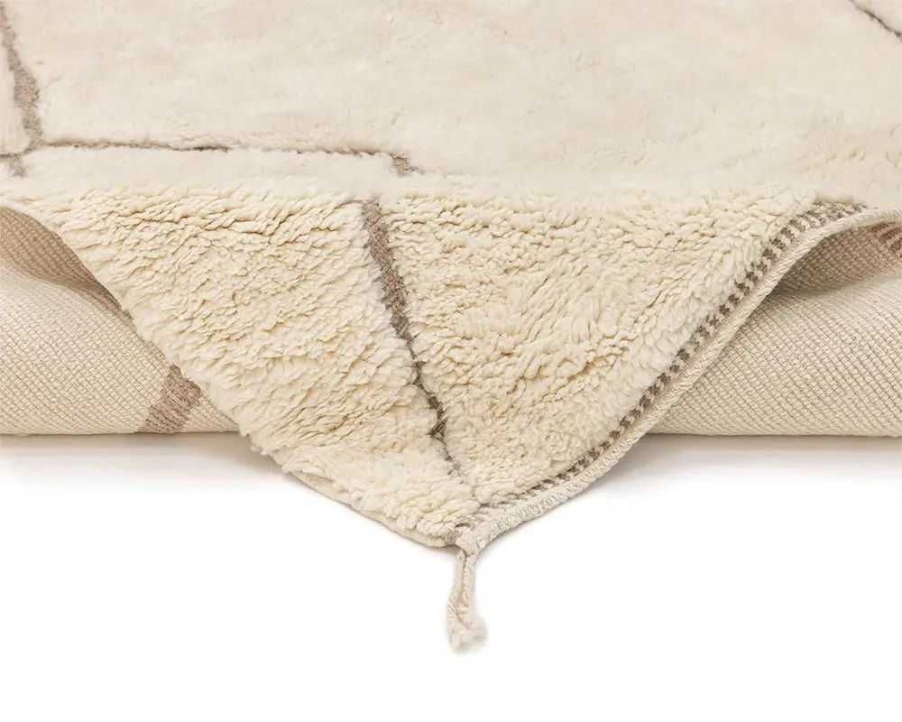 A close-up view of a beige textured rug with raised, soft, fuzzy stripes and a visible woven underside.