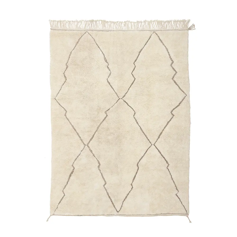 A beige woven rug with a diamond pattern and fringed edges adds subtle elegance to any space.