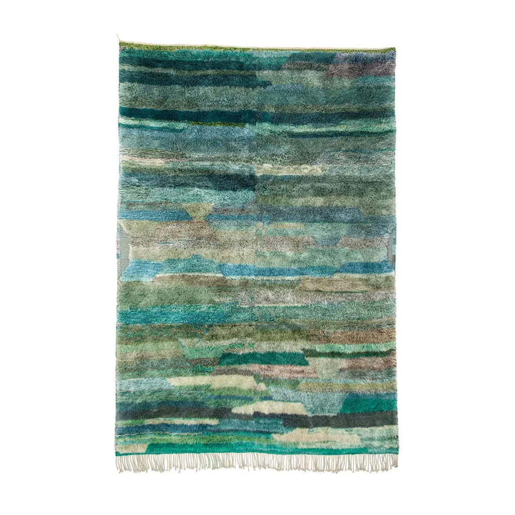 This luxurious hand-knotted Moroccan rug showcases an abstract geometric design with a dark upper section accentuated by a jagged green line. The lower area features a textured blend of purple and light beige, complemented by fringes at both the top and bottom.