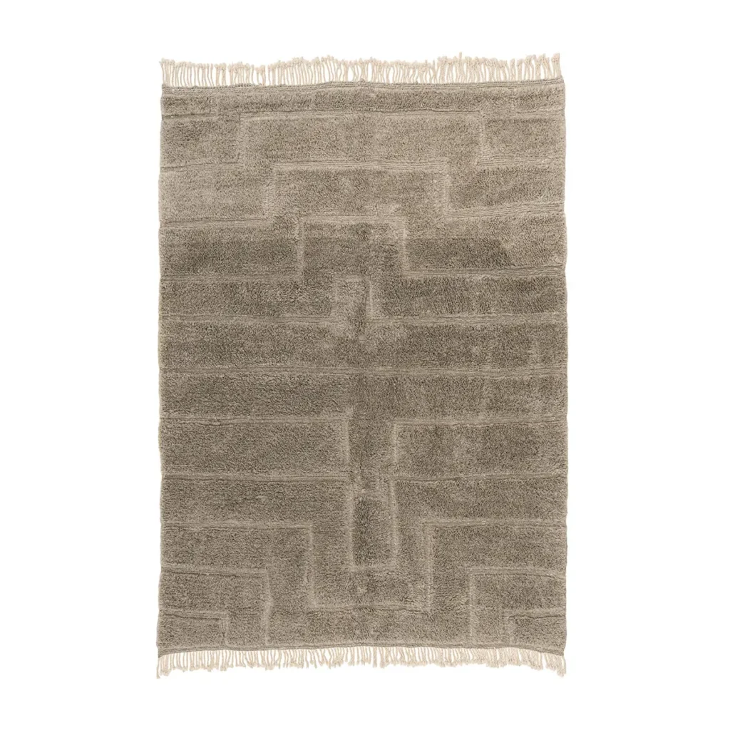 A close-up of a cream-colored, textured area rug with decorative fringe and a folded corner showing the woven underside.