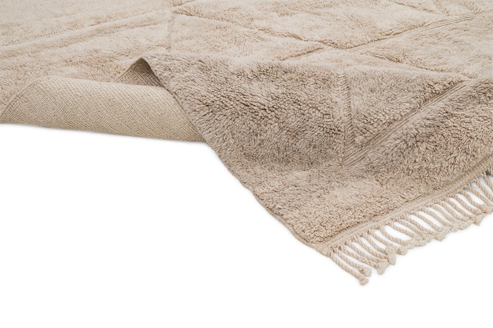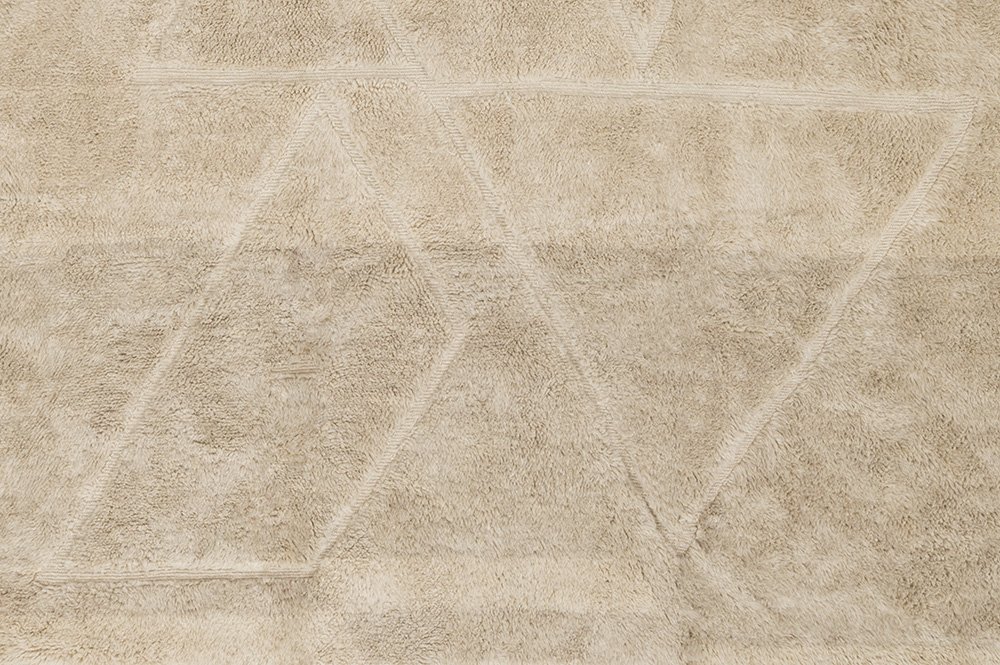 Natural hand-knotted wool rug in warm Cream Beige and light Ancient Grain with subtle geometric triangle patterns. The monochromatic palette and textured design offer a minimalist, earthy elegance, perfect for adding understated sophistication to any space.