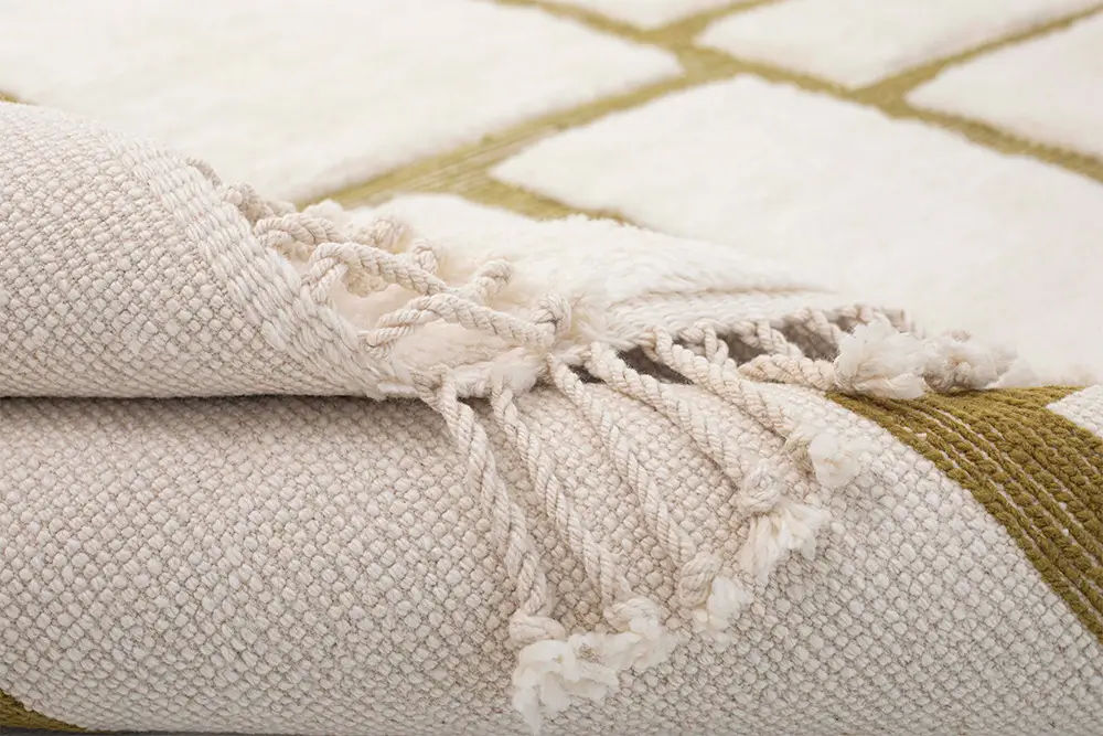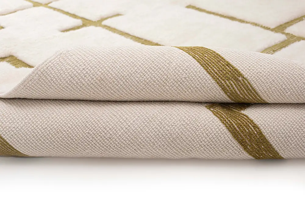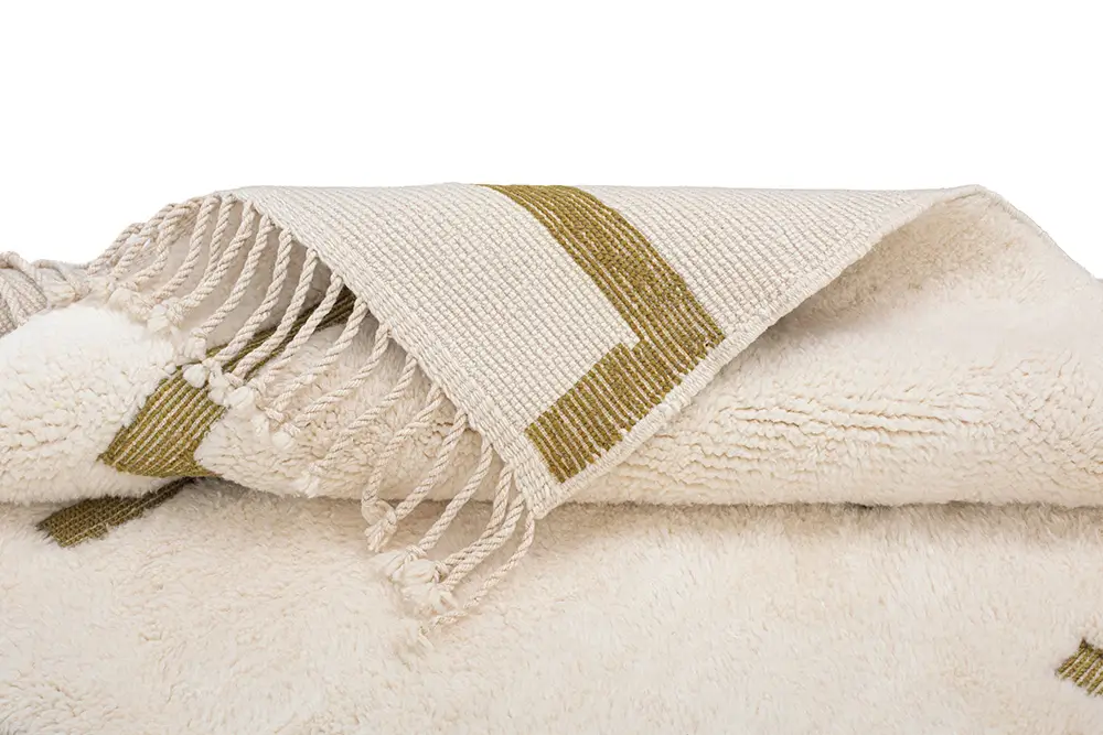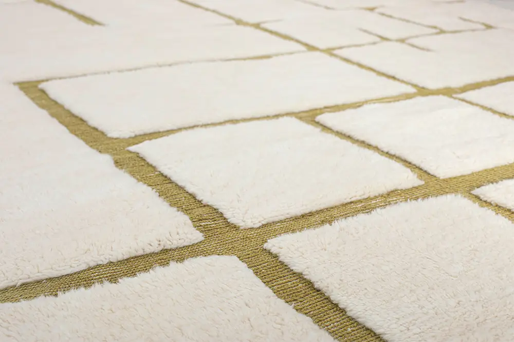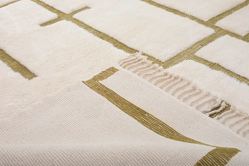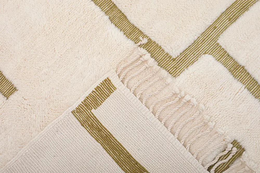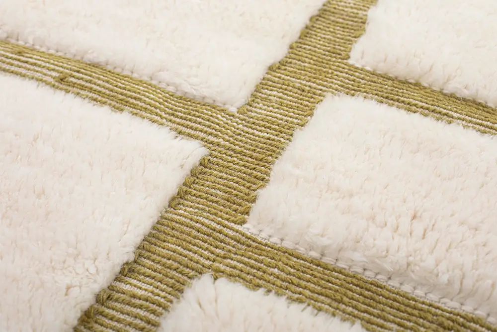 Elegant hand-knotted wool rug in soft Ivory, highlighted by geometric lines in Green Olive. The clean, structured design brings a sense of harmony and modern sophistication, making it a versatile piece that complements contemporary and classic interiors.