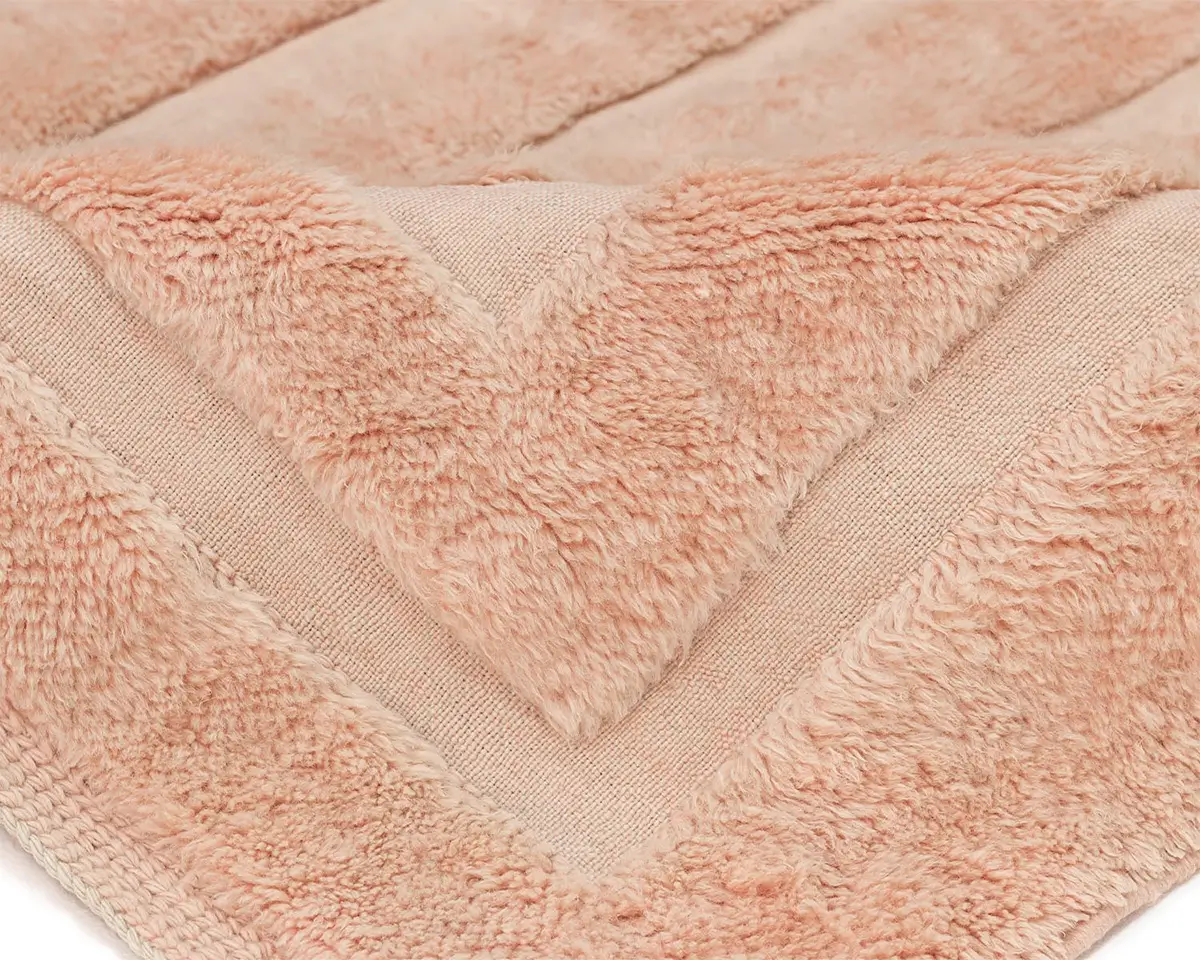 Elegant hand-knotted rug in rich Coral, crafted from premium wool with a crisp ‘Y’ shaped geometric pattern, perfect for adding warmth and sophistication to any living area.
