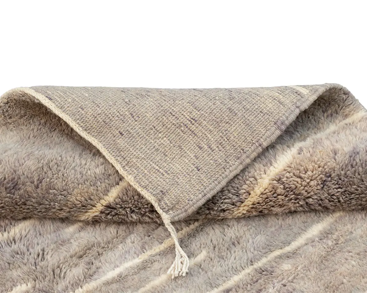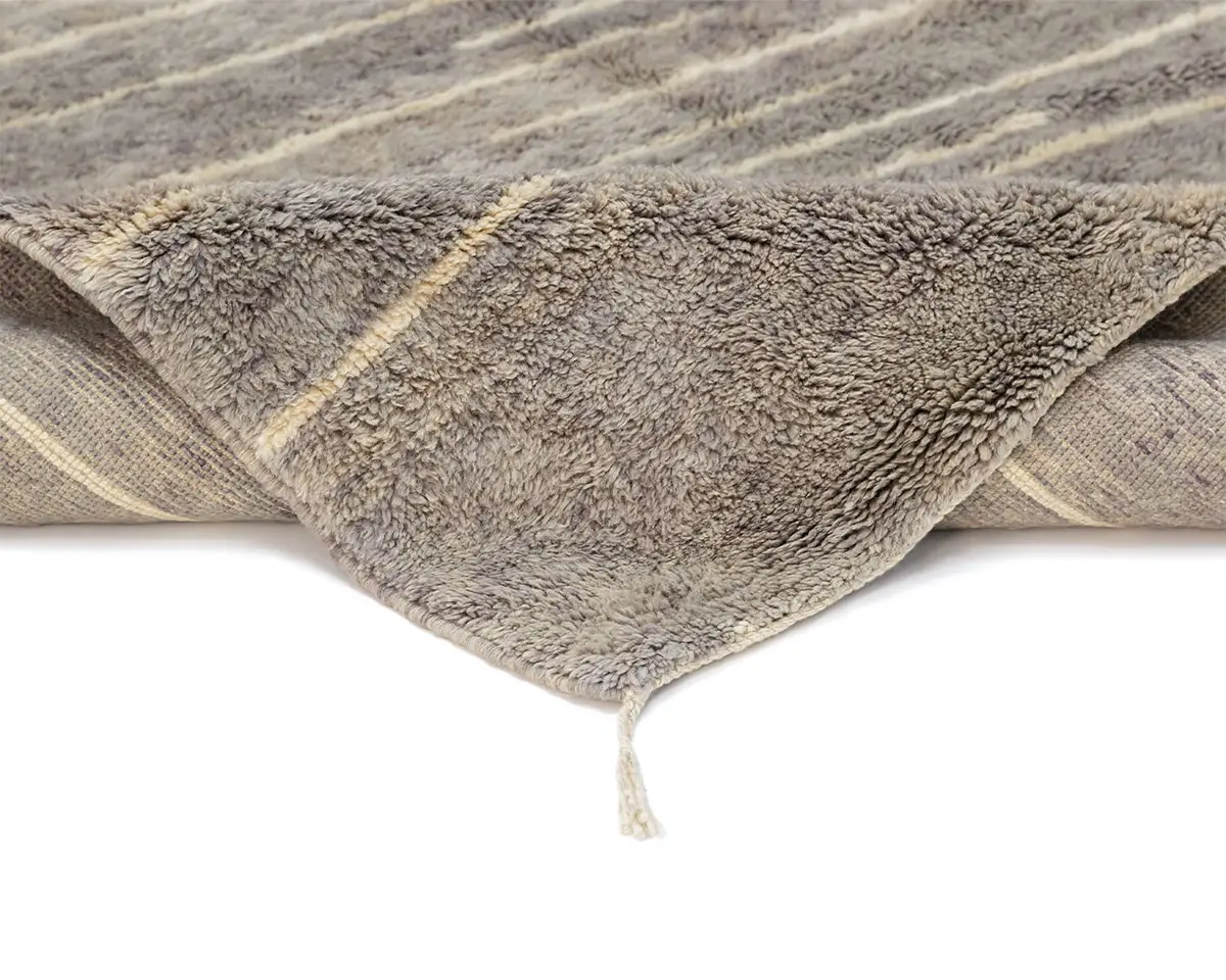 Refined hand-knotted wool rug with Ivory linear patterns in shades of Vintage Violet, Misty Taupe, and Velvet Fawn, providing a modern touch of texture and earthy tones to any living space.
