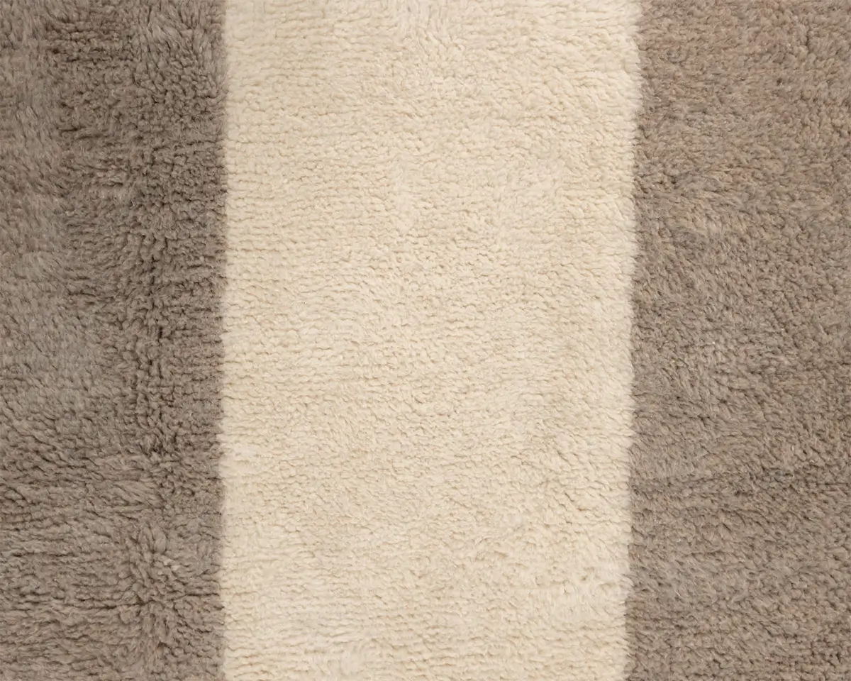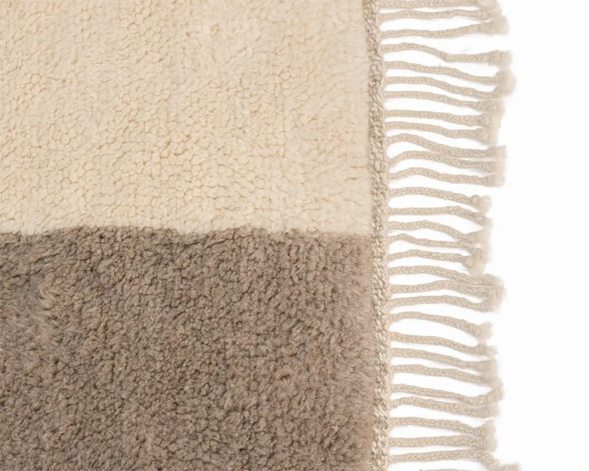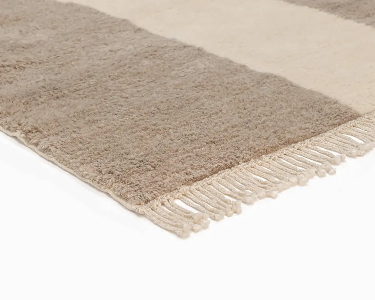 Sophisticated, Hand-knotted wool rug in muted Taupe with contrasting Ivory geometric accents, creating a minimalist yet impactful design for a serene and stylish space.