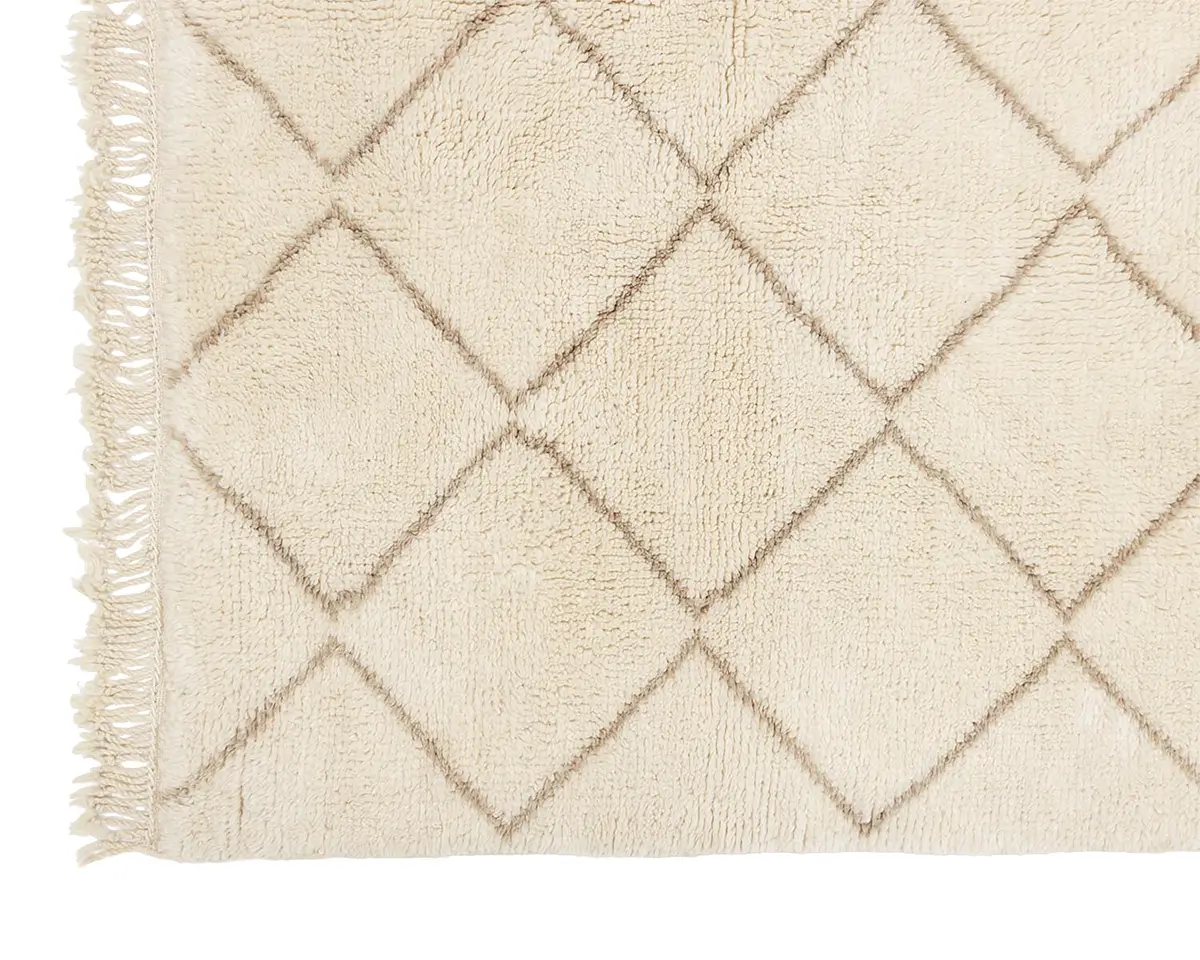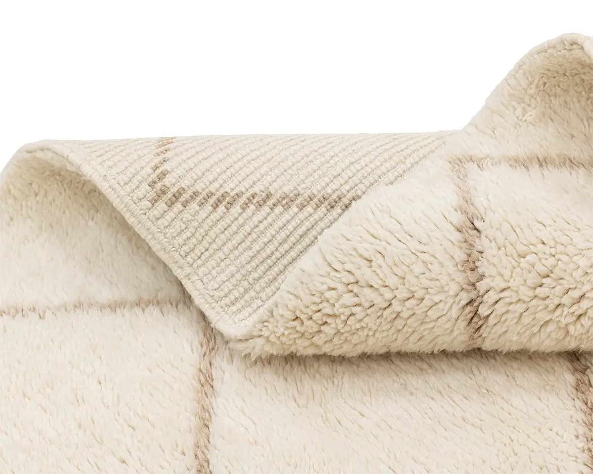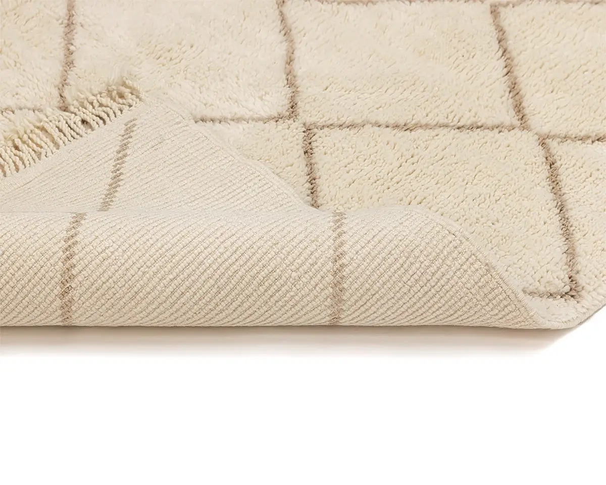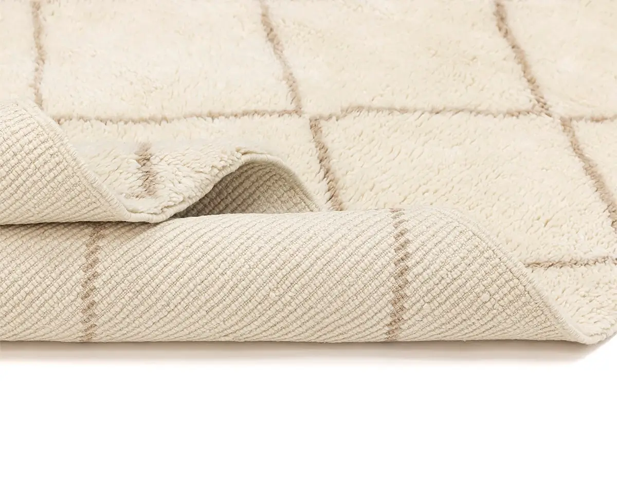 Elegant hand-knotted wool rug, featuring a lattice pattern in a harmonious blend of Ivory and Misty taupe, a versatile piece that brings comfort and artisanal charm to any decor.