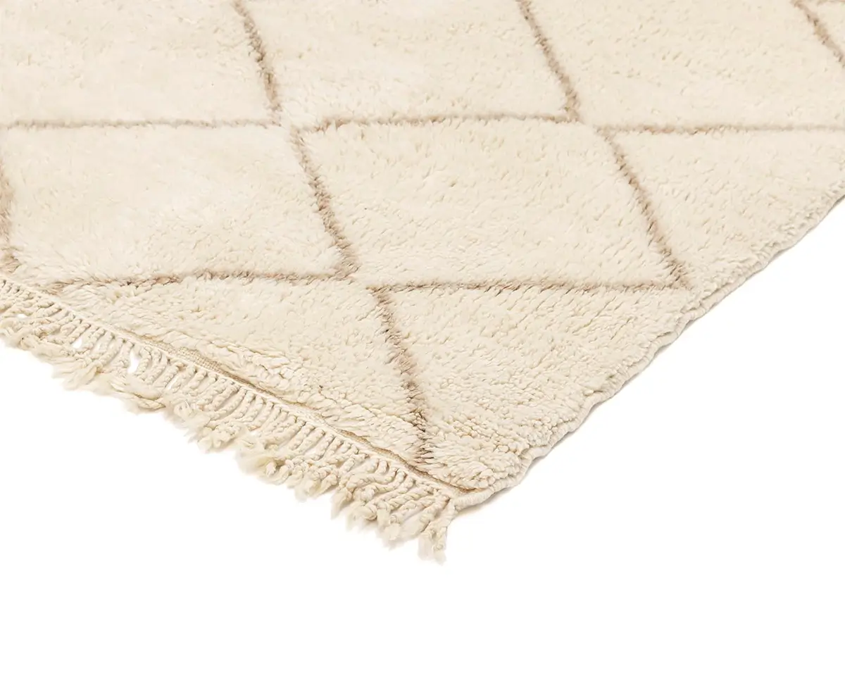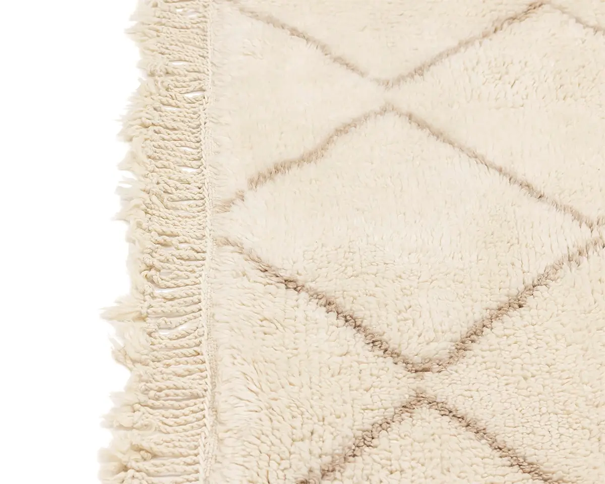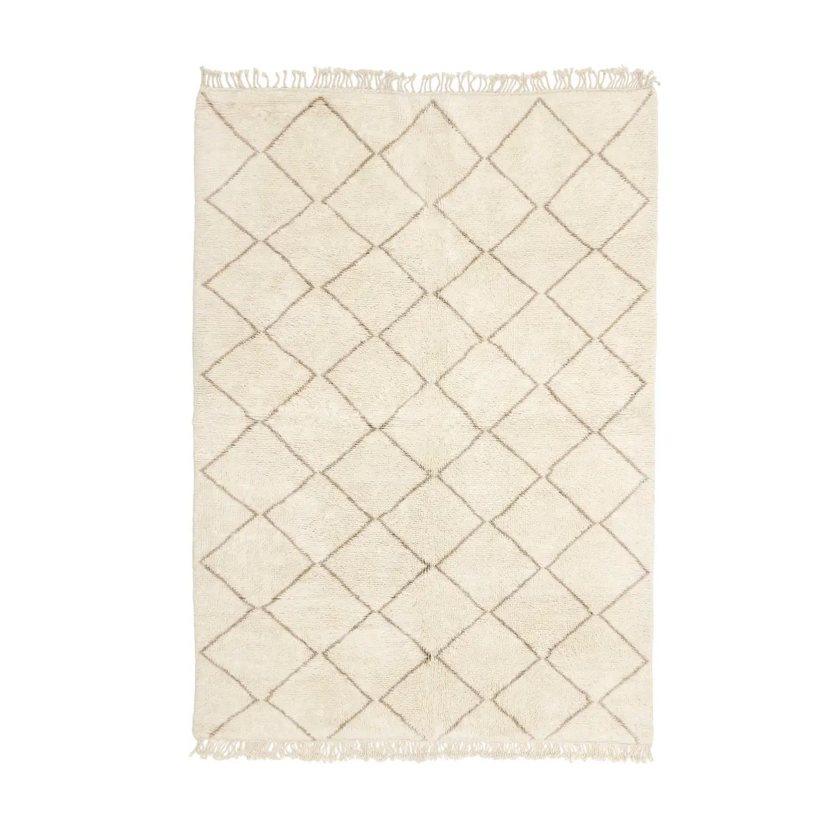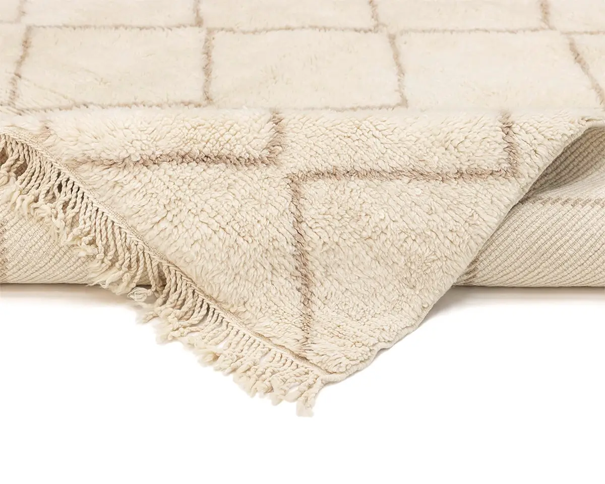 Elegant hand-knotted wool rug, featuring a lattice pattern in a harmonious blend of Ivory and Misty taupe, a versatile piece that brings comfort and artisanal charm to any decor.
