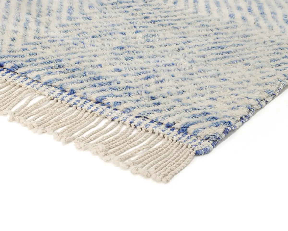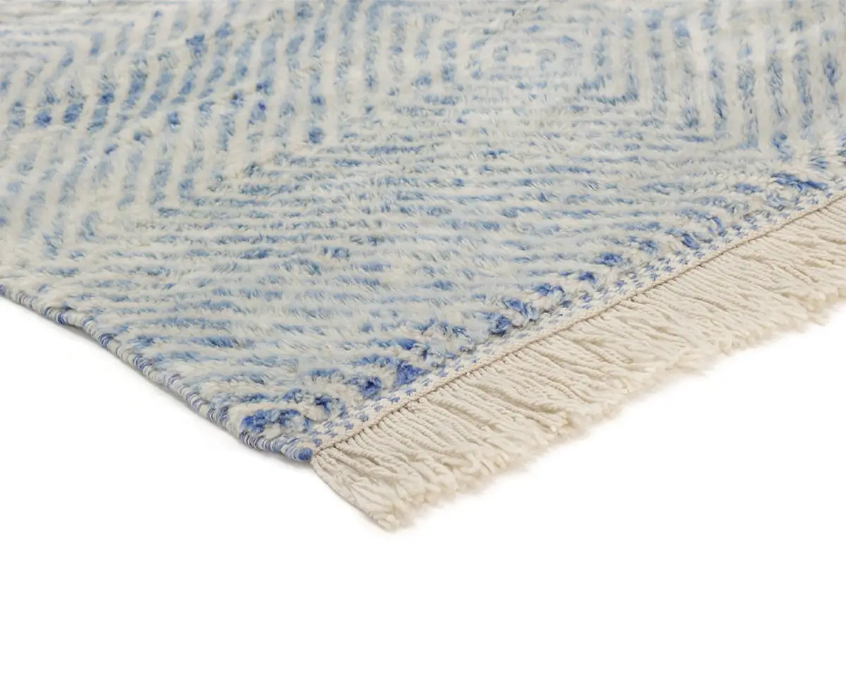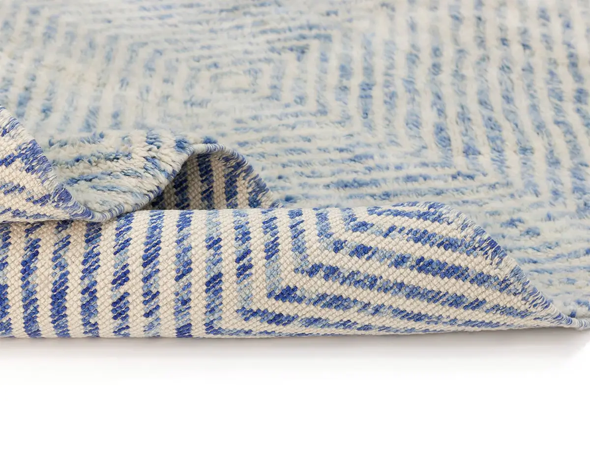Elegant luxurious hand-knotted wool rug with a serene diamond pattern in Soft Azure and Ivory, offering a plush texture and subtle elegance for any living space.