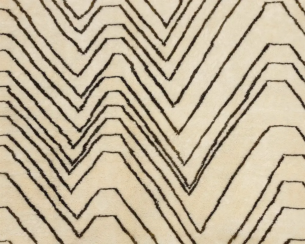 Refined hand-knotted wool rug with an Ivory base and contrasting Midnight Black asymmetrical chevron patterns, infusing a modern graphic element into any decor.