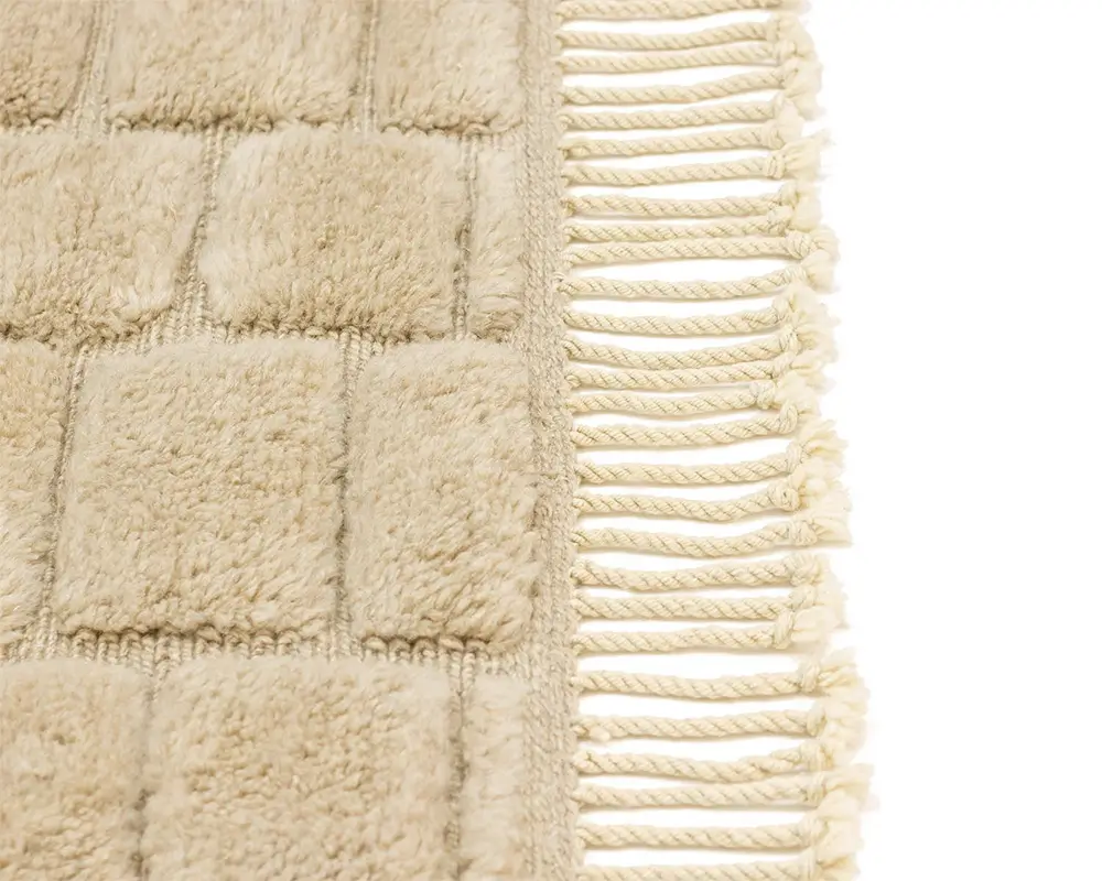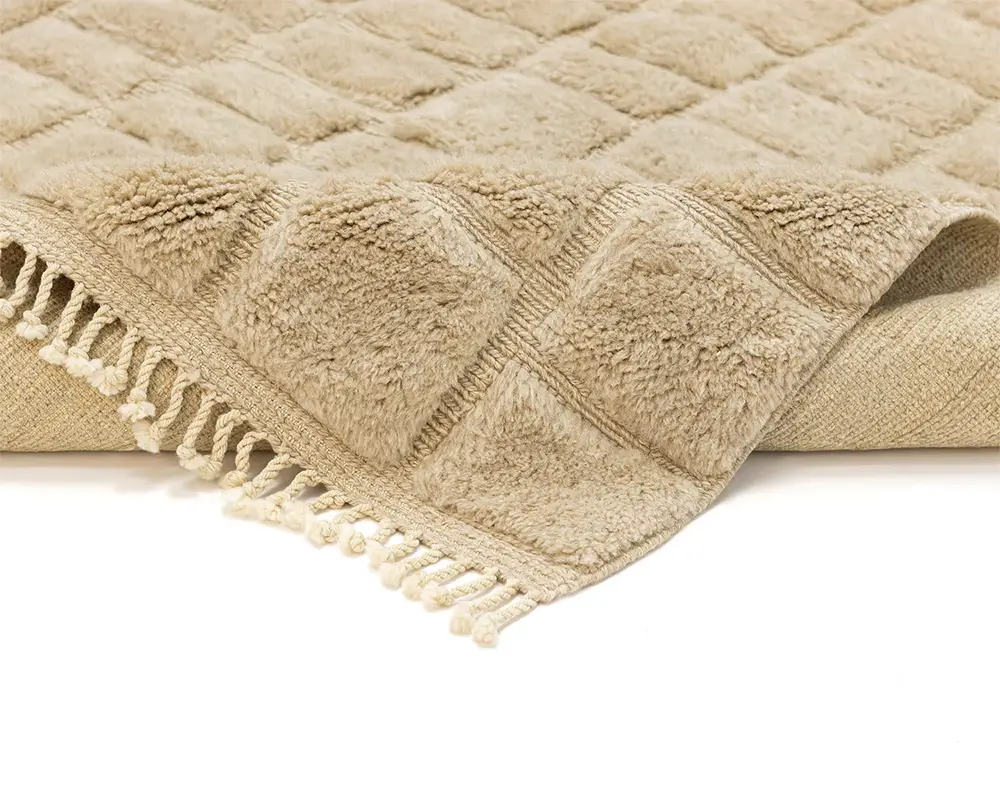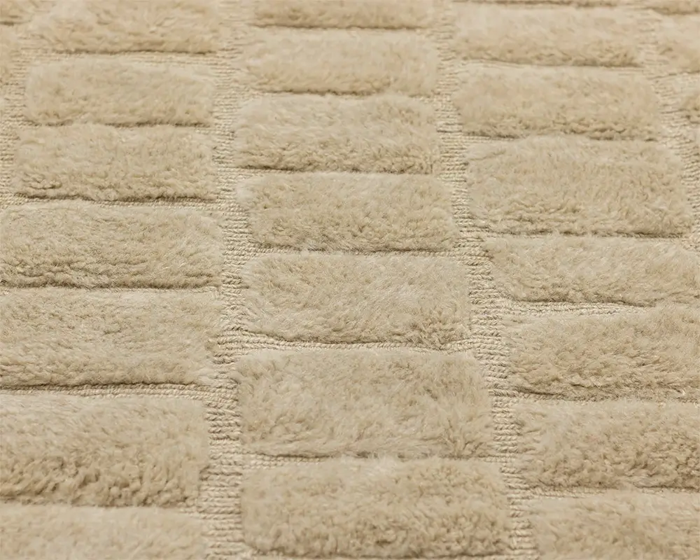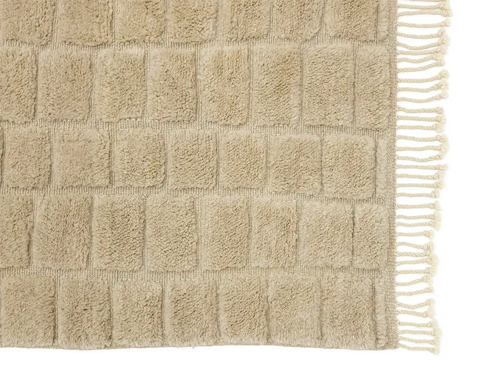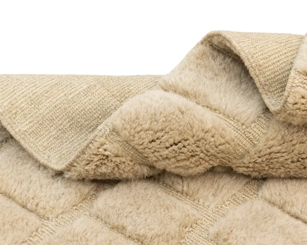 Minimalist hand-knotted wool rug with a textured checkerboard pattern in Velvet Fawn tones offers a plush feel and a refined look for modern and traditional interiors.