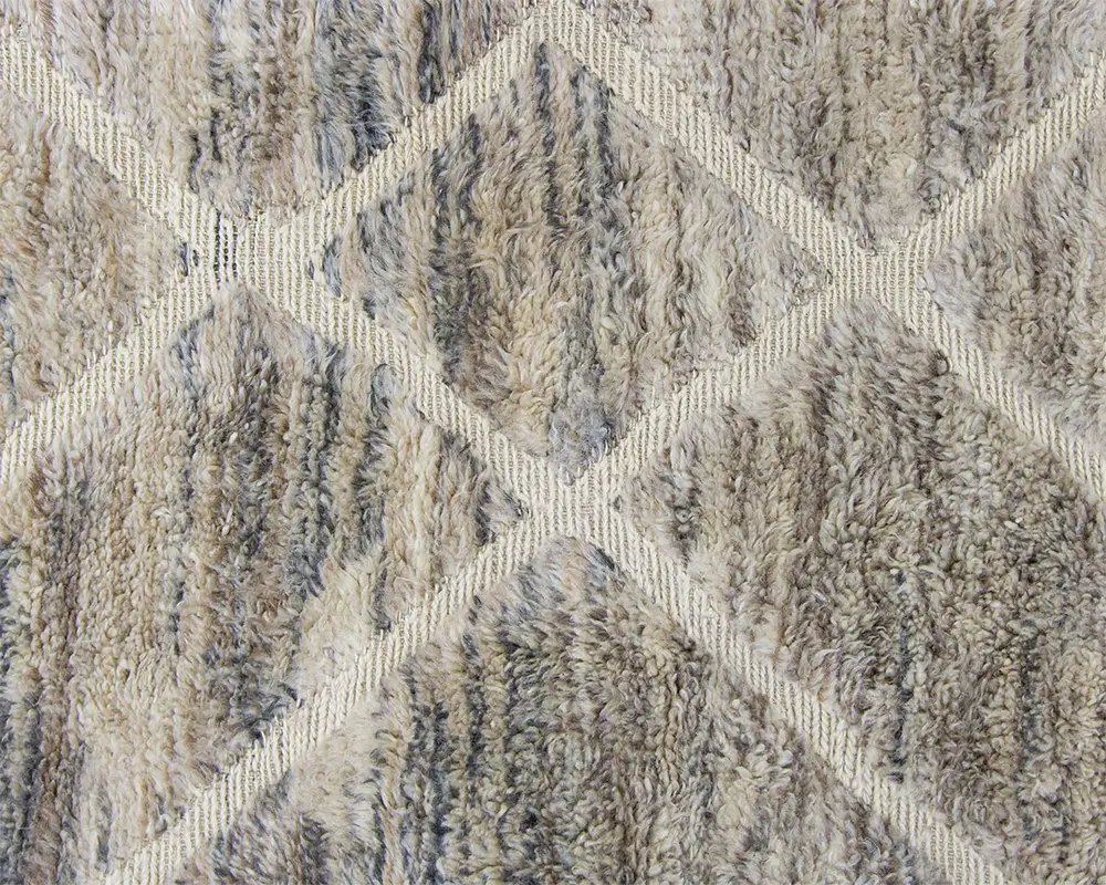Hand-knotted rug with a blend of Sand, Taupe, and Ivory hues in a distinctive diamond design, crafted from wool for lasting comfort and timeless style.