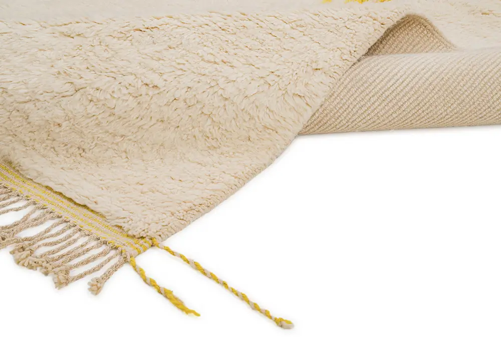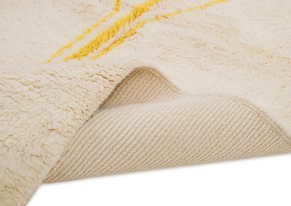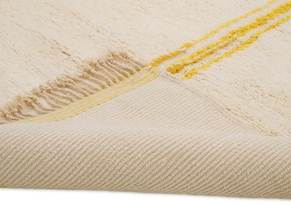 Elegant hand-knotted wool rug in warm Ivory, featuring minimalist Yellow linework. This unique piece blends traditional craftsmanship with a modern, understated design, perfect for adding subtle sophistication to any room.