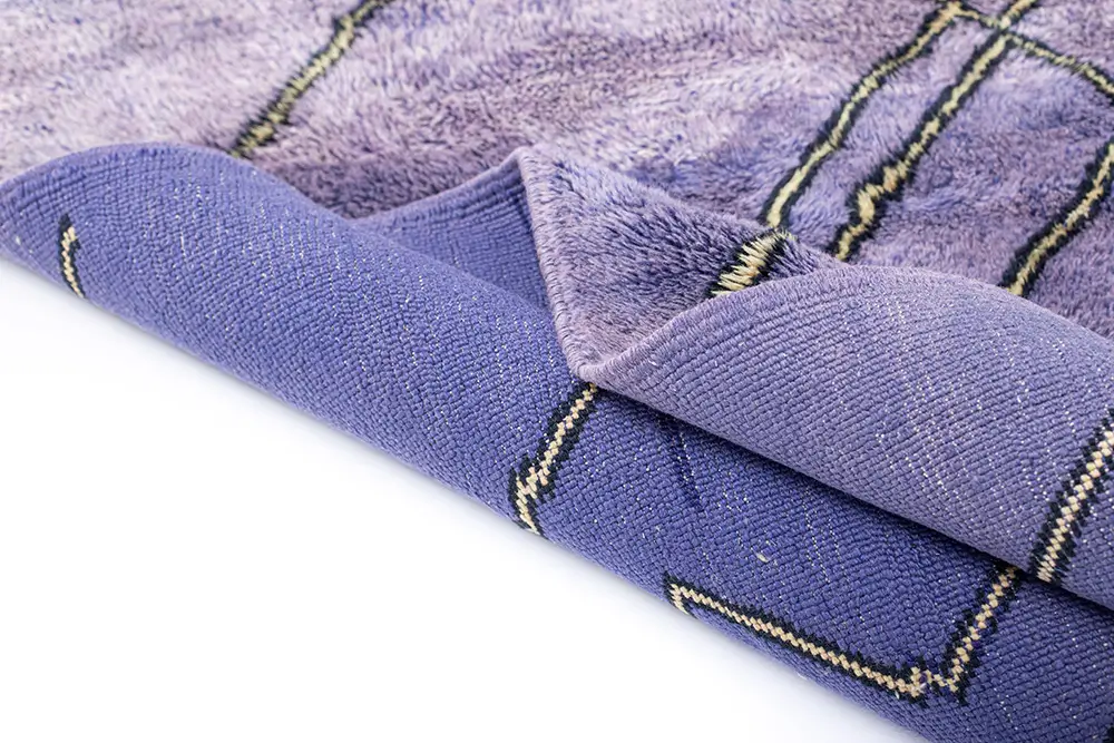 Eye-catching hand-knotted wool rug in vibrant Lavender, Violet, and Lilac tones, featuring intricate Process Yellow and Midnight black linework in a geometric lattice pattern. This bold design adds a lively, artistic flair, perfect for brightening any room.