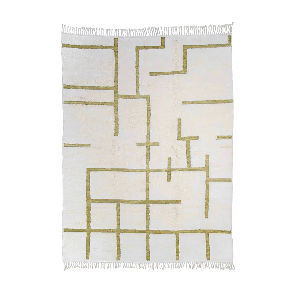 Experience the elegance of an artisanal rug, featuring green-and-cream stripes and fringed edges on a pristine white background. This hand-knotted piece adds a touch of sophistication to any room.