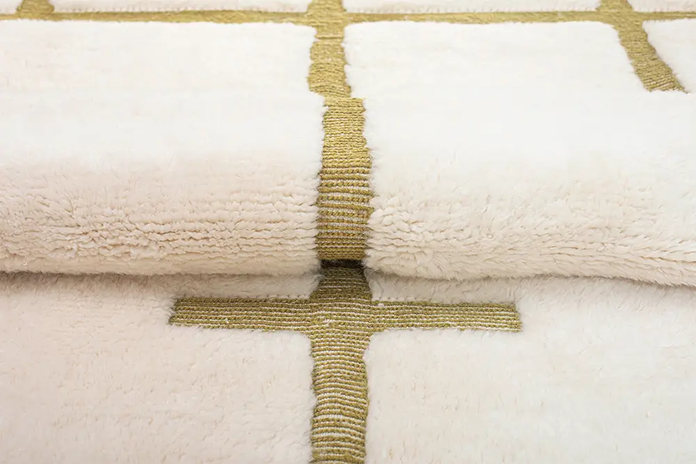 A close-up of a cream-colored textured rug, partially folded to show both its plush and woven sides.