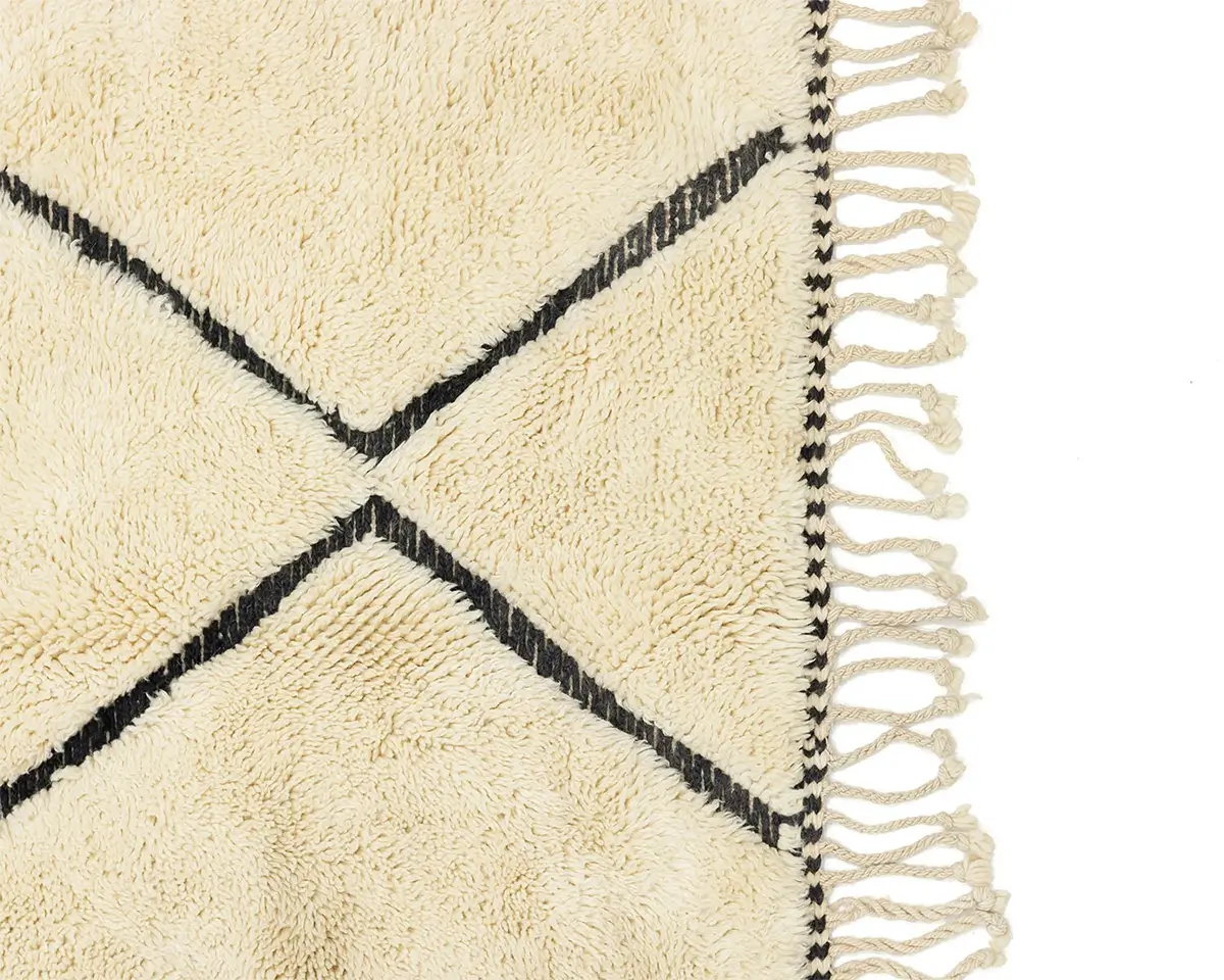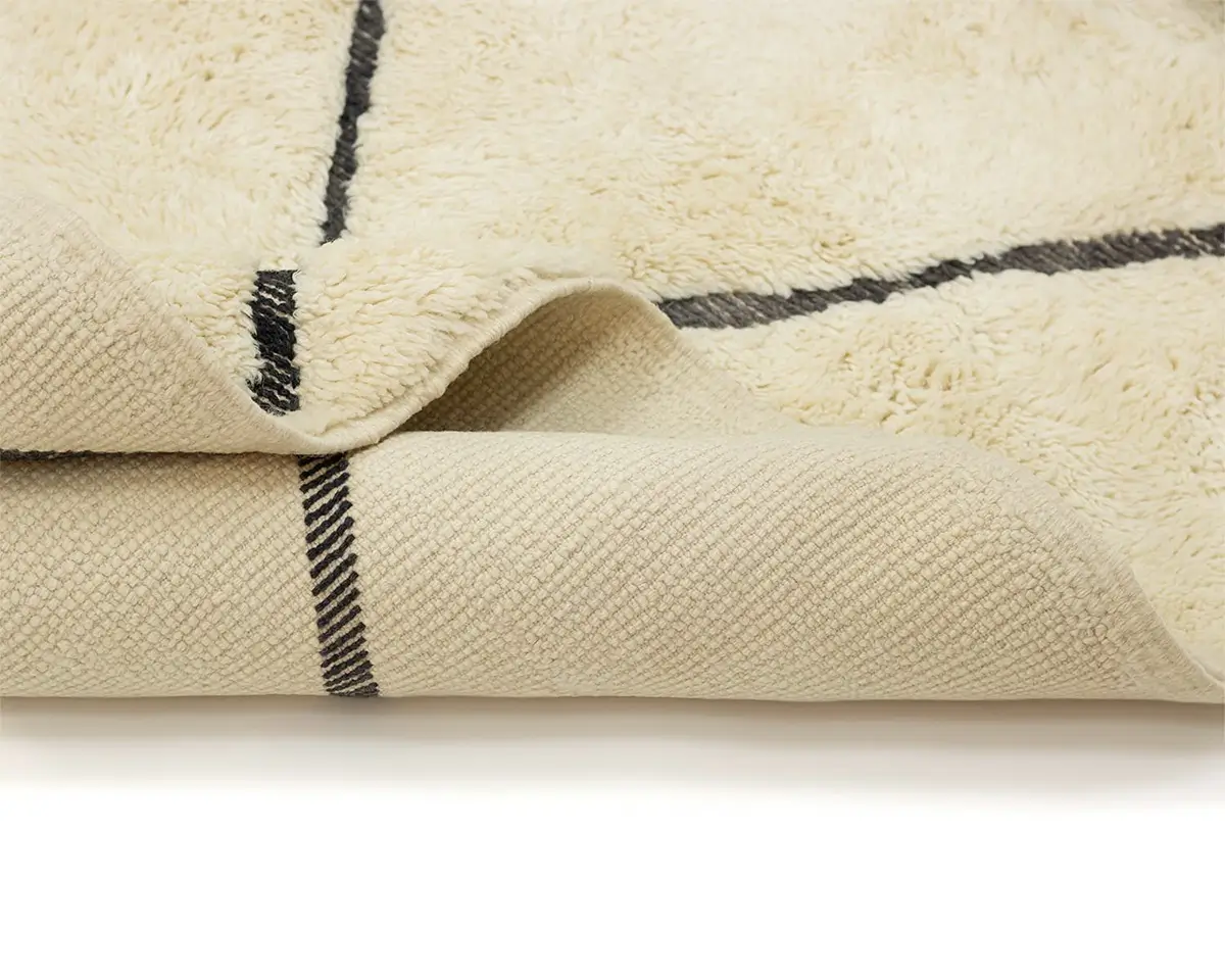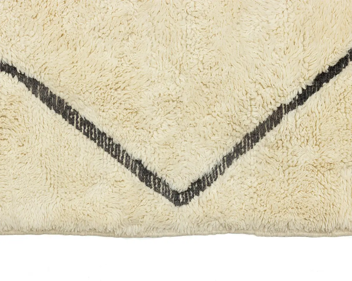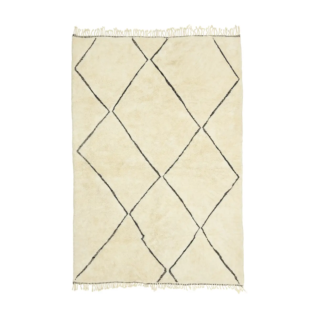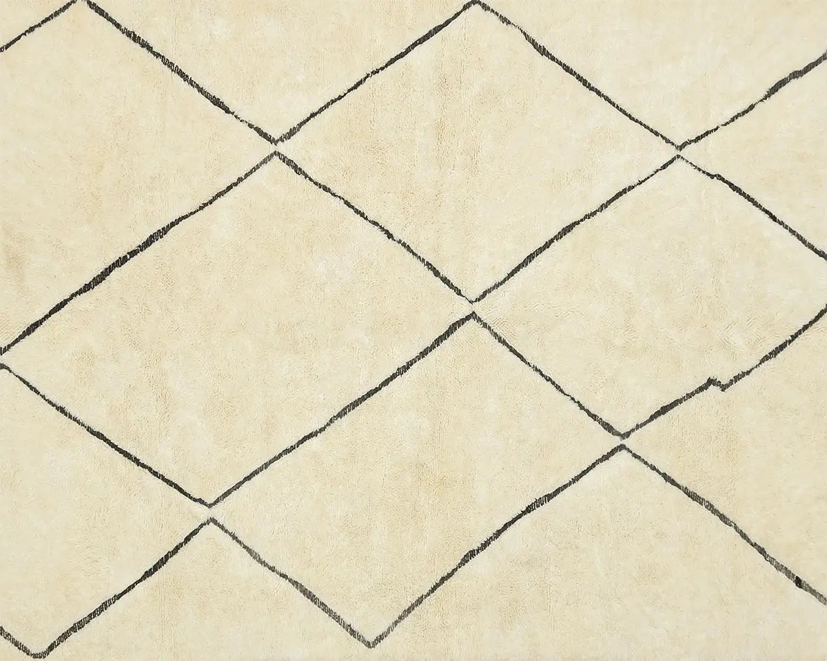 Timeless hand-knotted wool rug in Ivory, adorned with asymmetrical Charcoal diamond patterns, offering a chic and versatile addition to any space seeking a touch of minimalist sophistication.