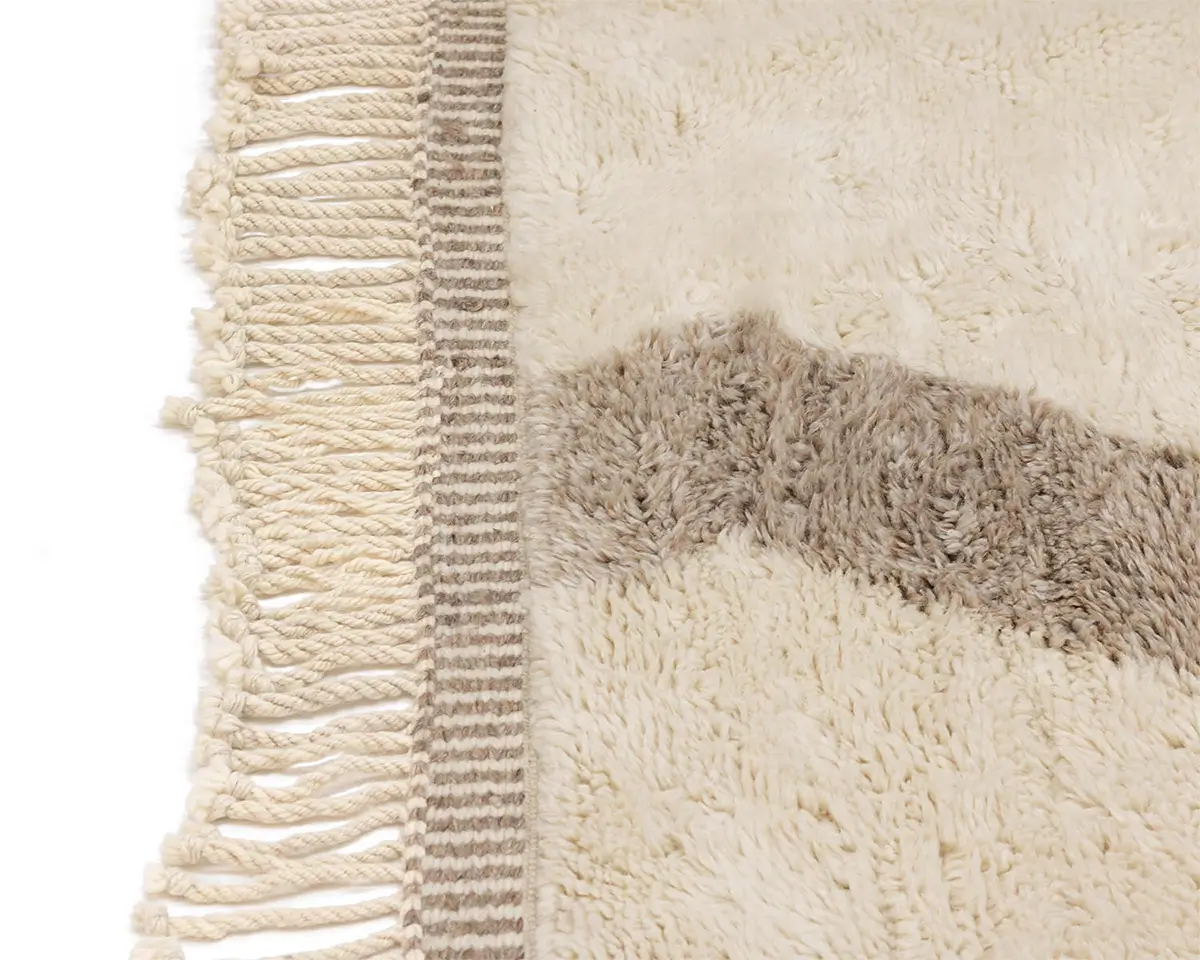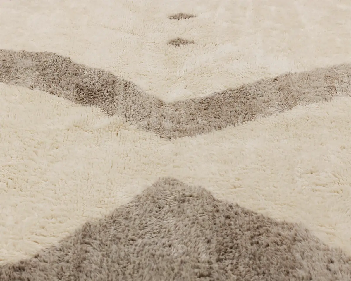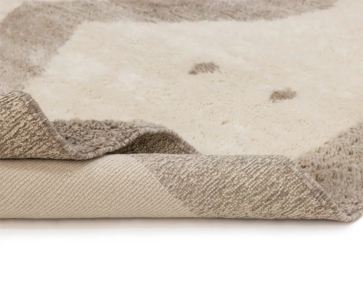 Stunning hand-knotted rug with an abstract motif in contrasting shades of Ivory and Misty Taupe, creating a bold, artistic statement that’s both contemporary and comforting.