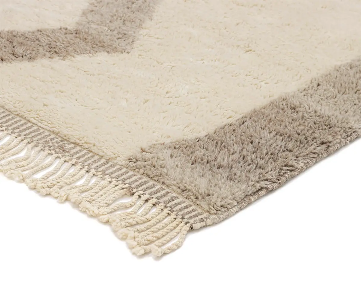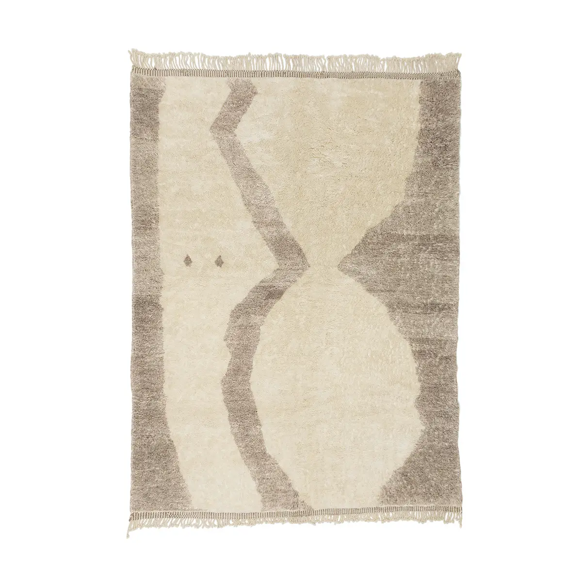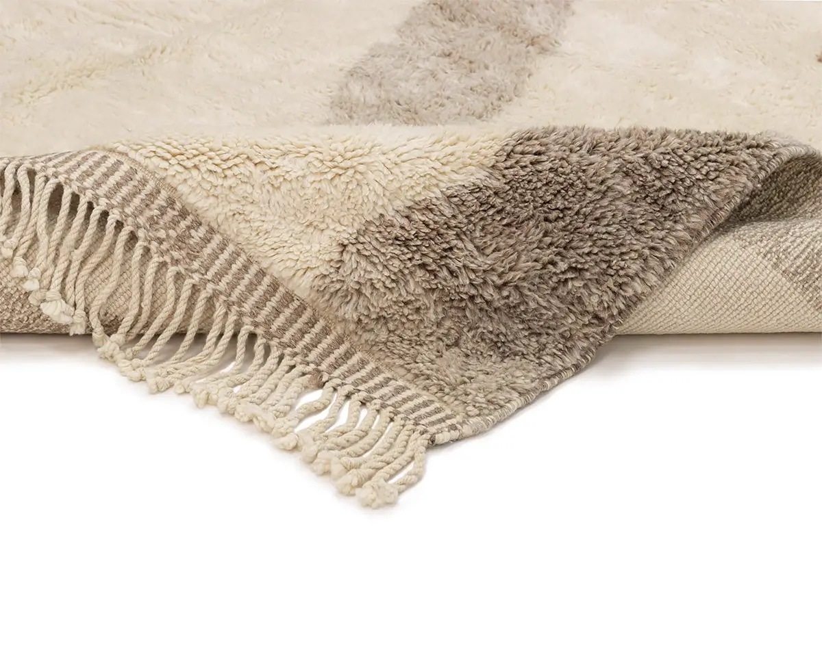 Stunning hand-knotted rug with an abstract motif in contrasting shades of Ivory and Misty Taupe, creating a bold, artistic statement that’s both contemporary and comforting.