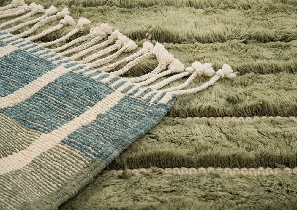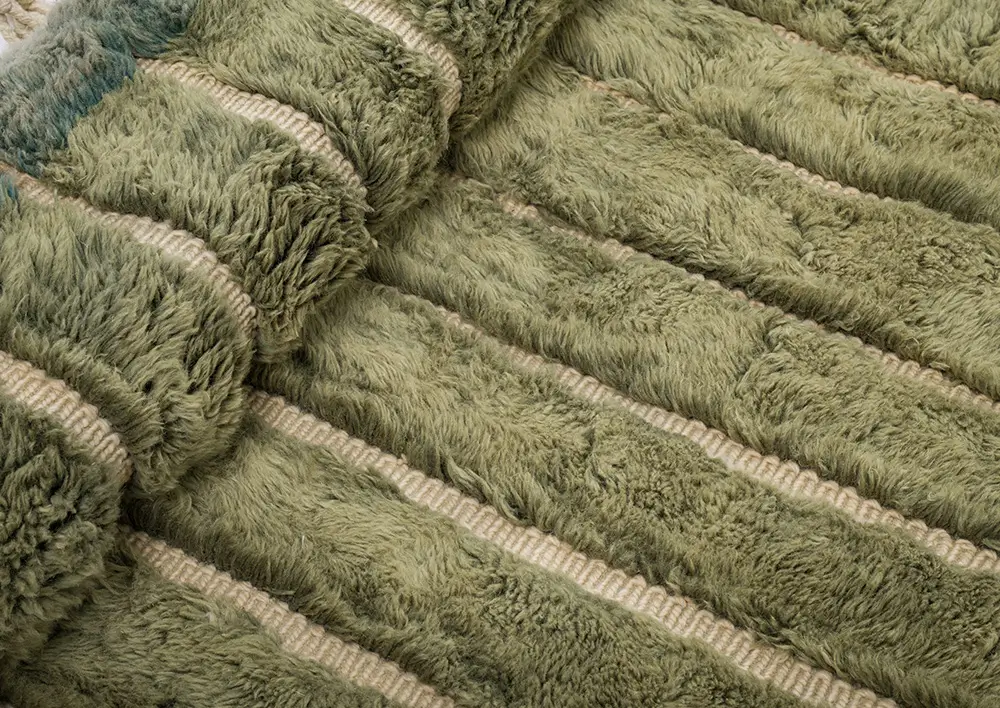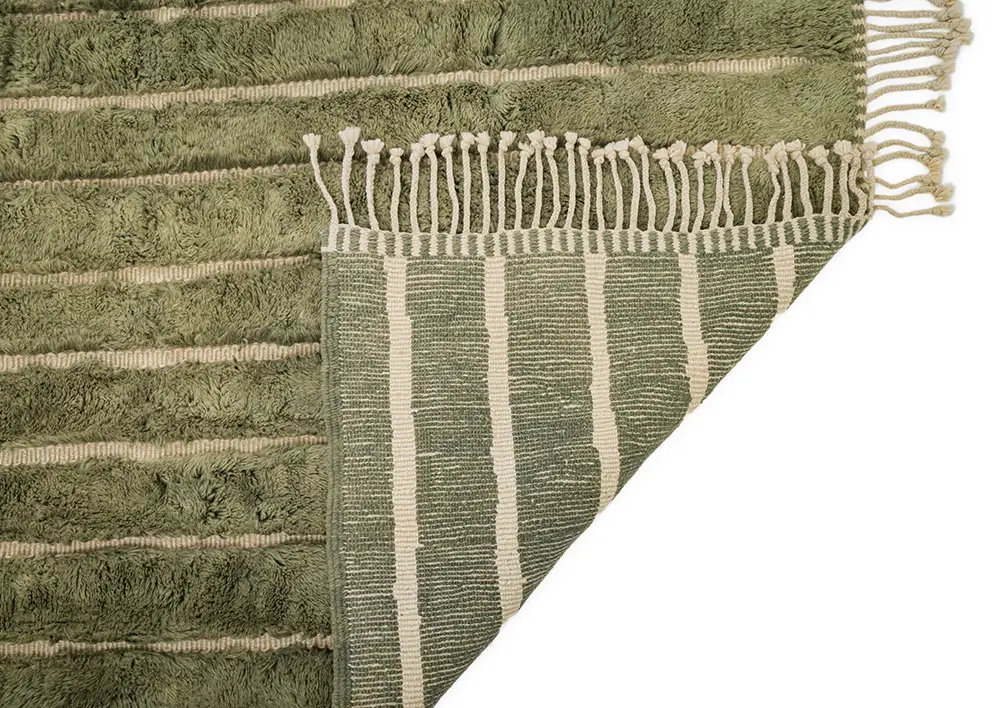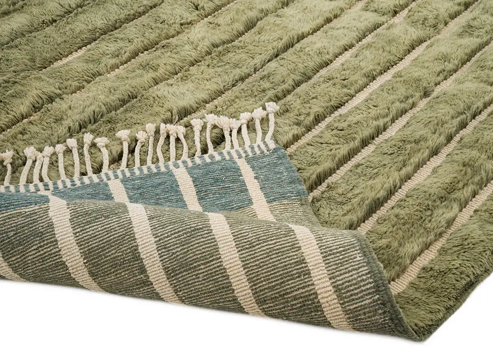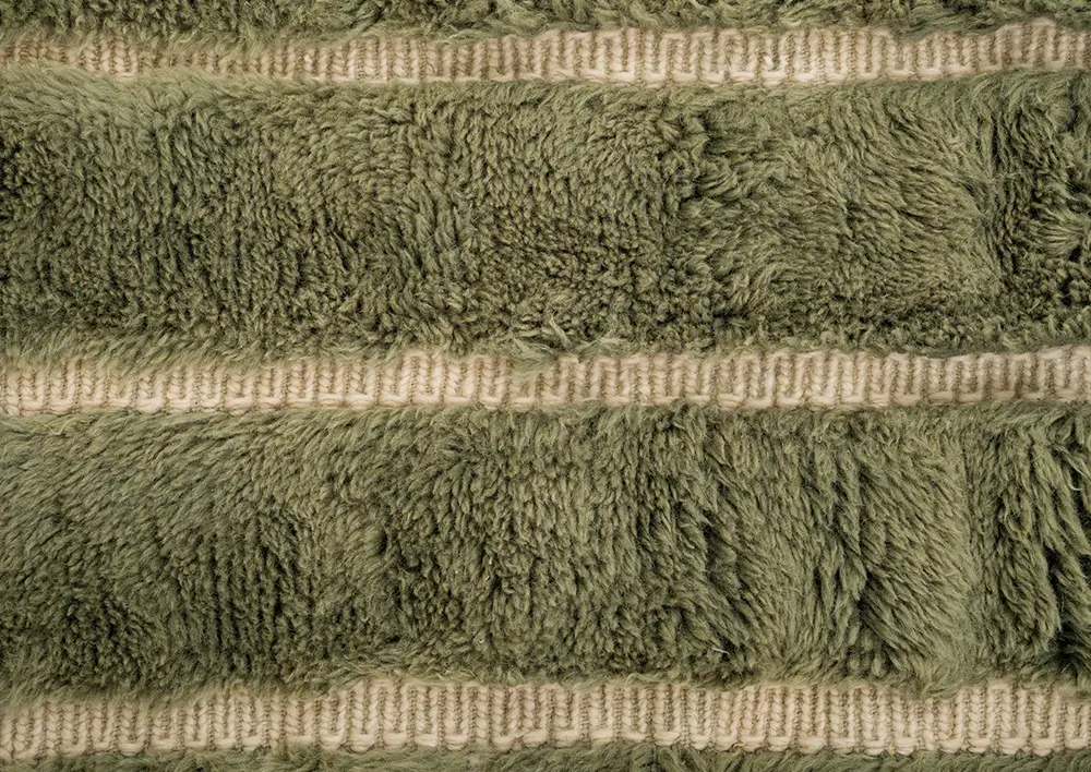 Luxurious Olive Green and Sage stripes highlight the plush texture of this artisan-crafted wool rug. Its subtle, modern design brings a refined, natural elegance, making it an ideal addition to any space.