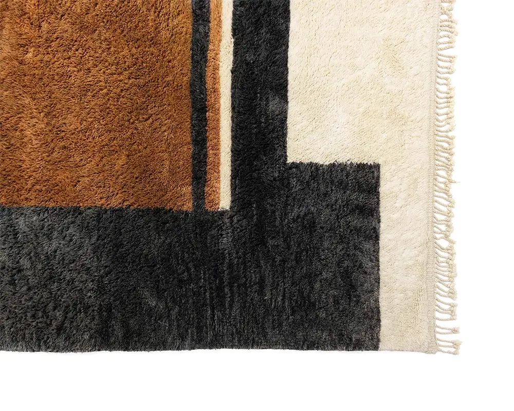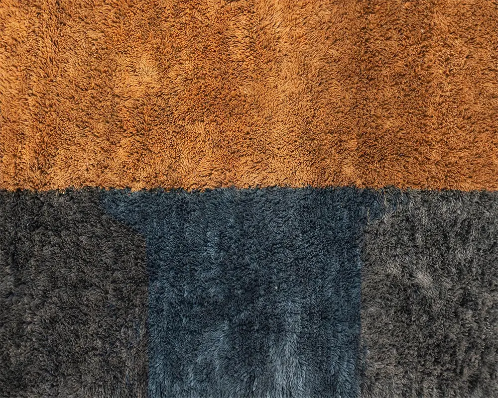 Blending Tangerine, Blue, Gray, Black, and Ivory hues, this hand-knotted wool rug offers a rich tapestry of modern geometry. The interplay of bold and neutral blocks anchors any space with depth and contemporary refinement.