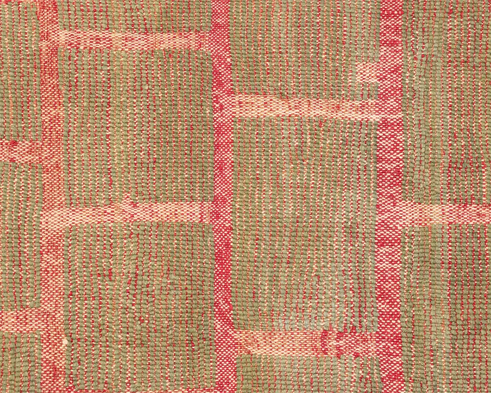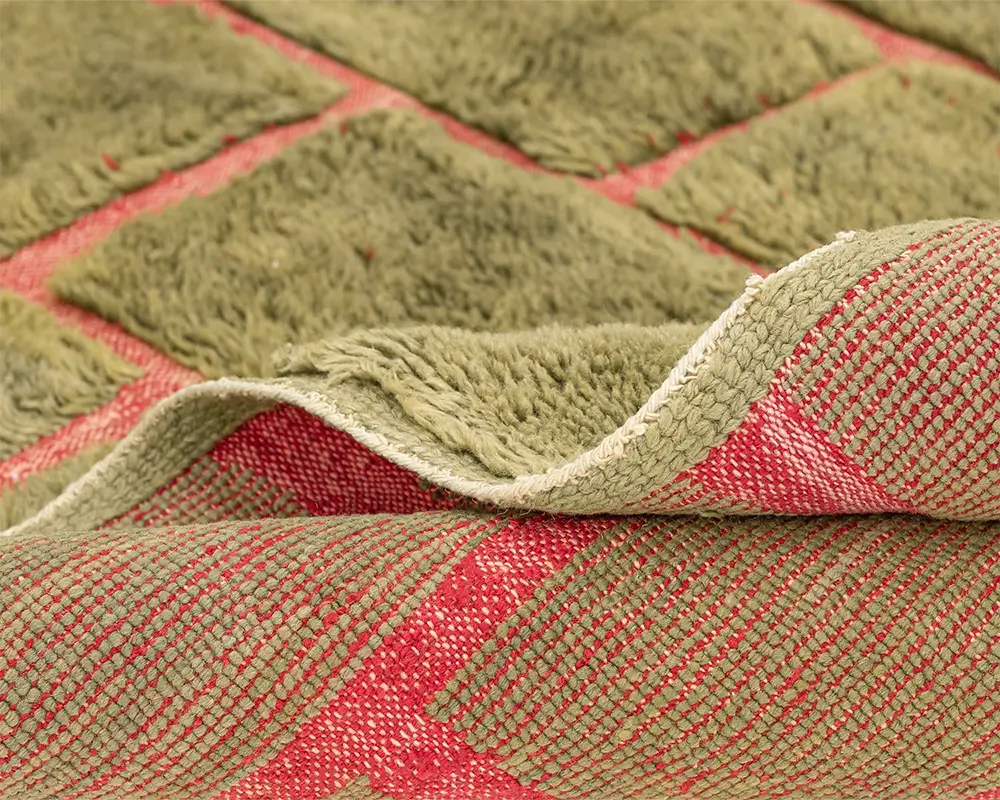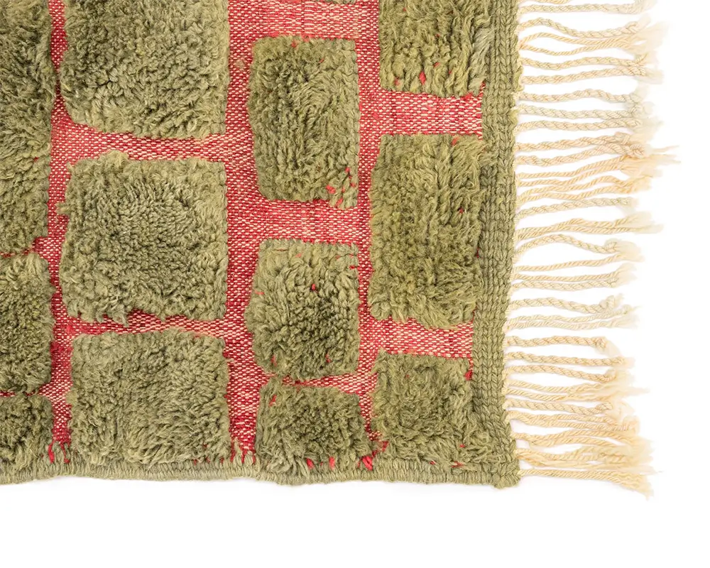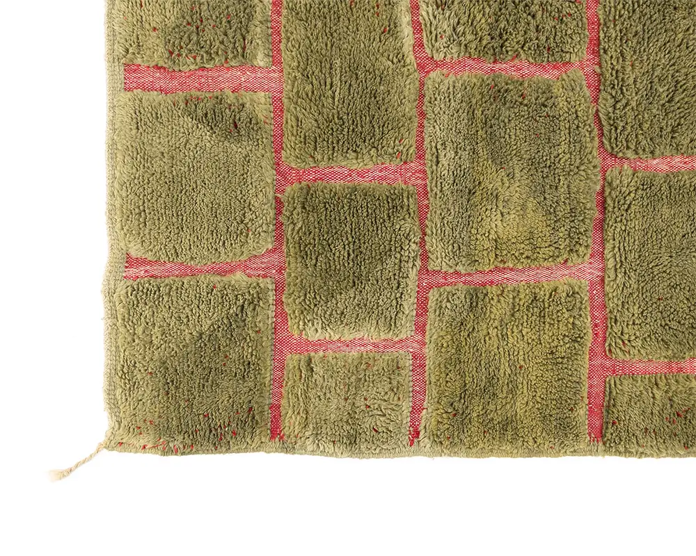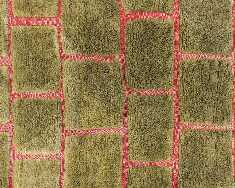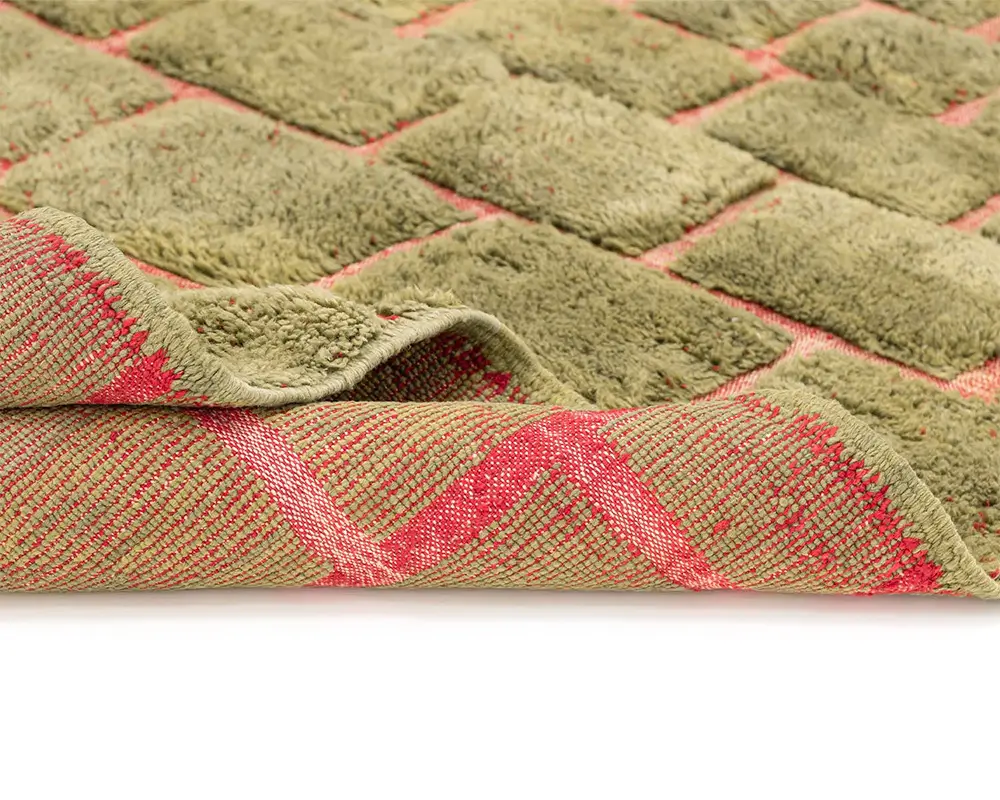 Vibrant hand-knotted rug featuring a hand-woven brick-like pattern in Olive Oasis and Carmin, offering a lush, textured surface that adds depth and a natural aesthetic to any space.