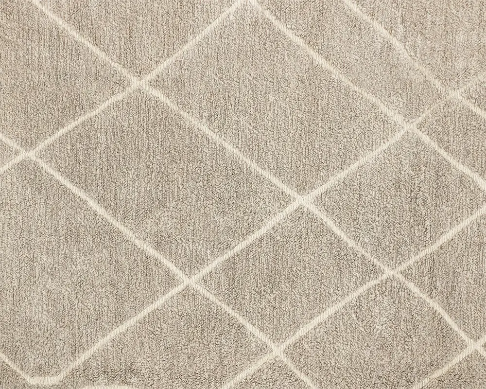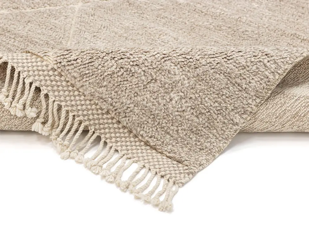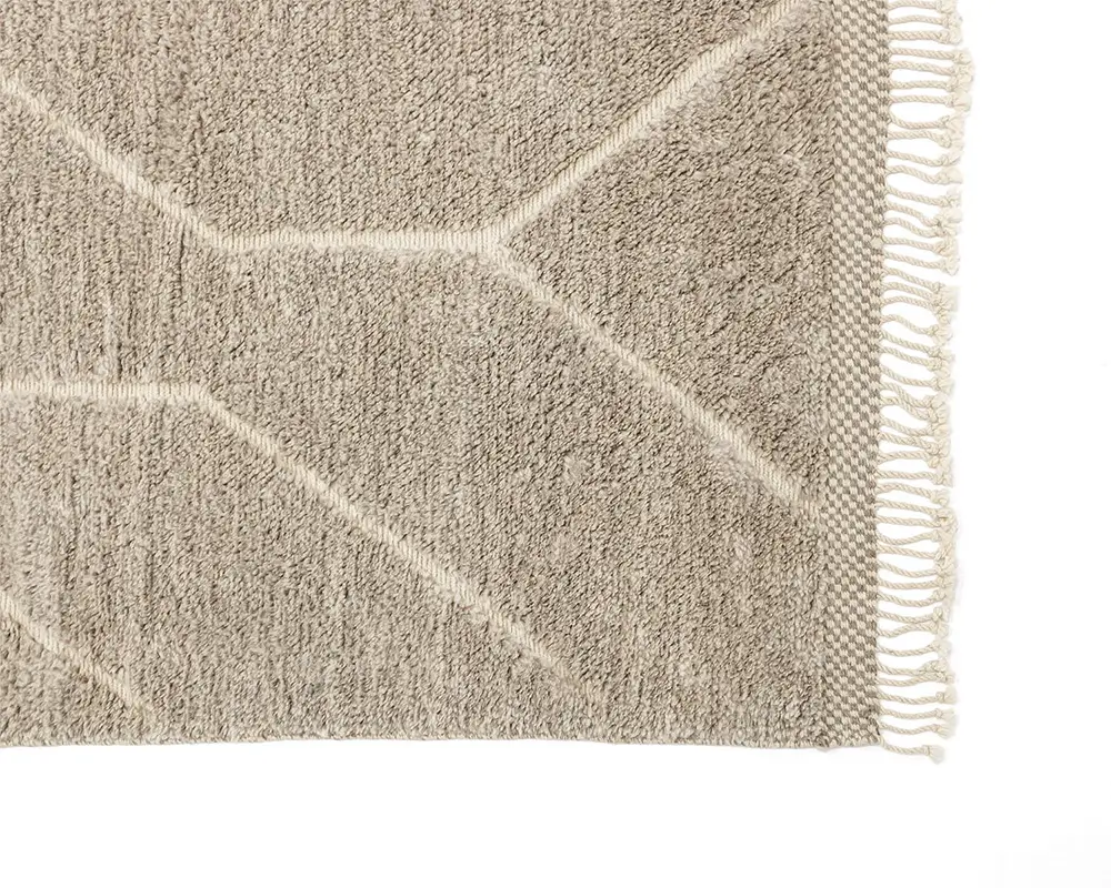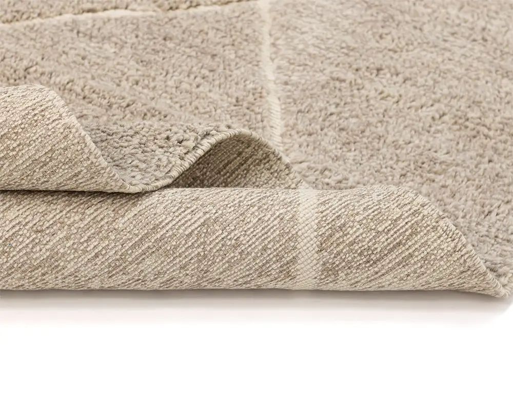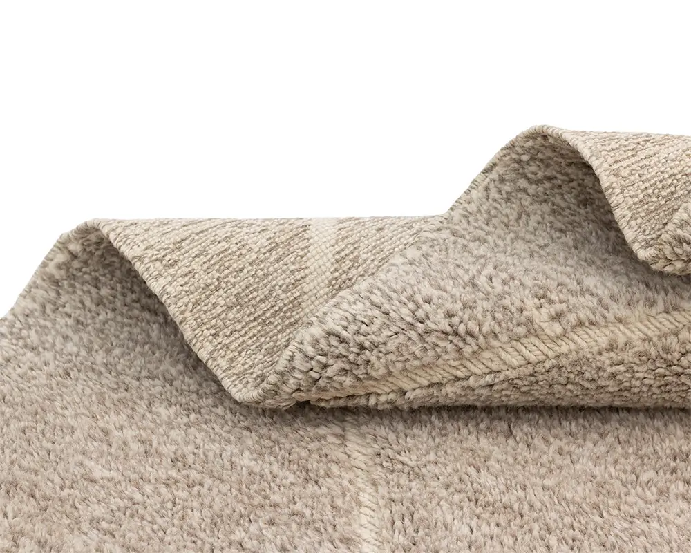 Luxurious hand-knotted wool rug, featuring a neutral Sand hue with a subtle hand-woven Ivory line pattern, designed to blend seamlessly into any decor style with its understated elegance.