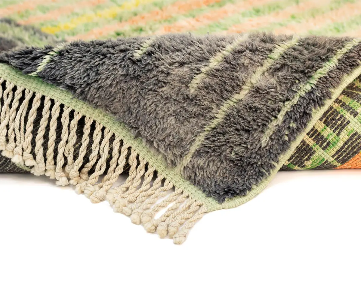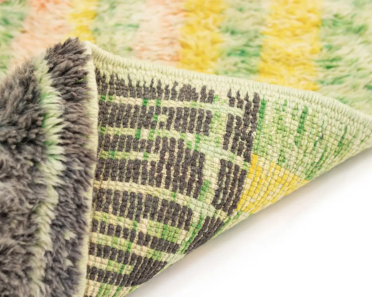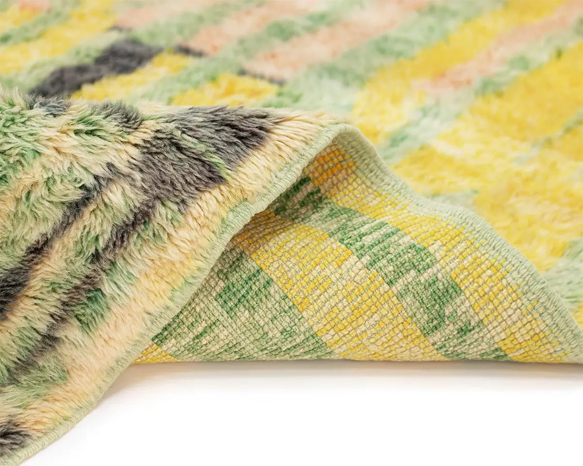 Exquisite hand-knotted rug, captivating with its vibrant pattern, harmoniously blending shades of Chartreuse Yellow, Charcoal Gray, Desert Rose, and Avocado Green. Perfect for infusing a burst of color and texture into any living space.